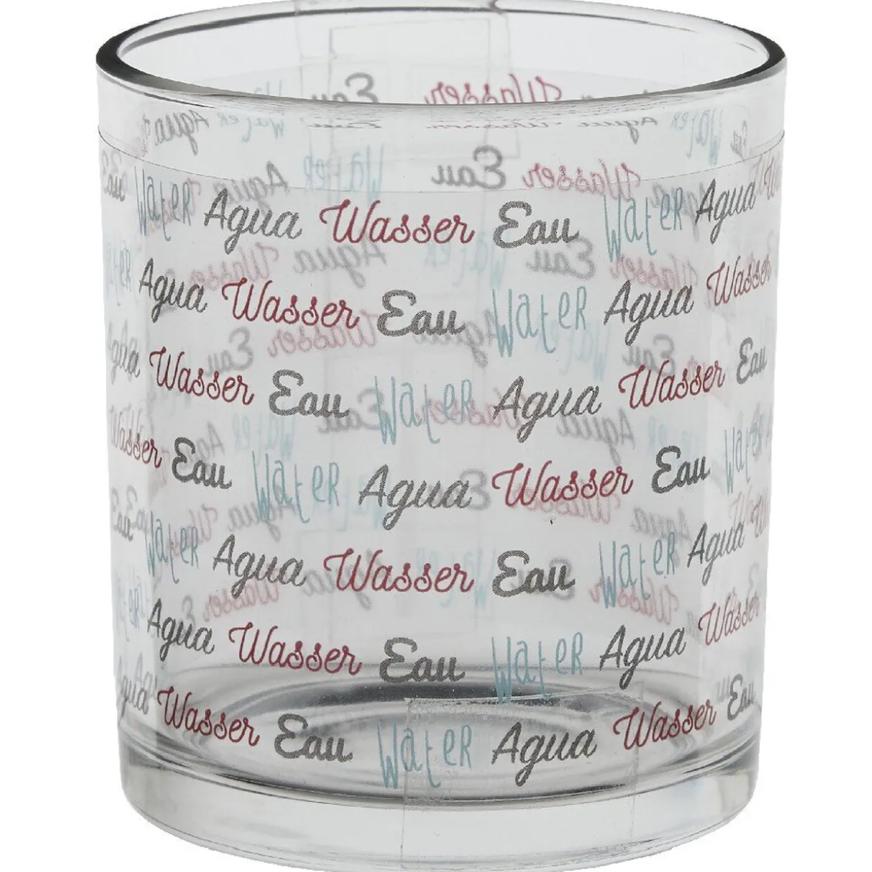 Bouteille à boisson d’une contenance de 1 litre transparente et avec inscription du mot EAU en différentes langues.
