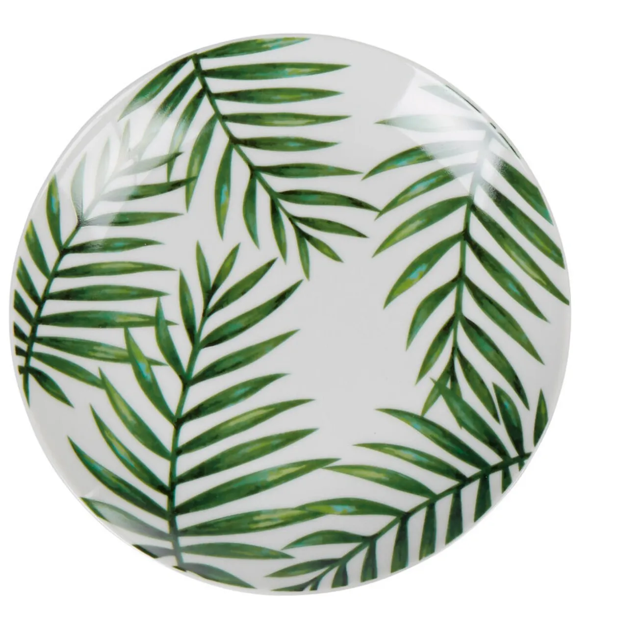 Assiette à dessert ronde et blanche décorée de feuillages exotiques verts.