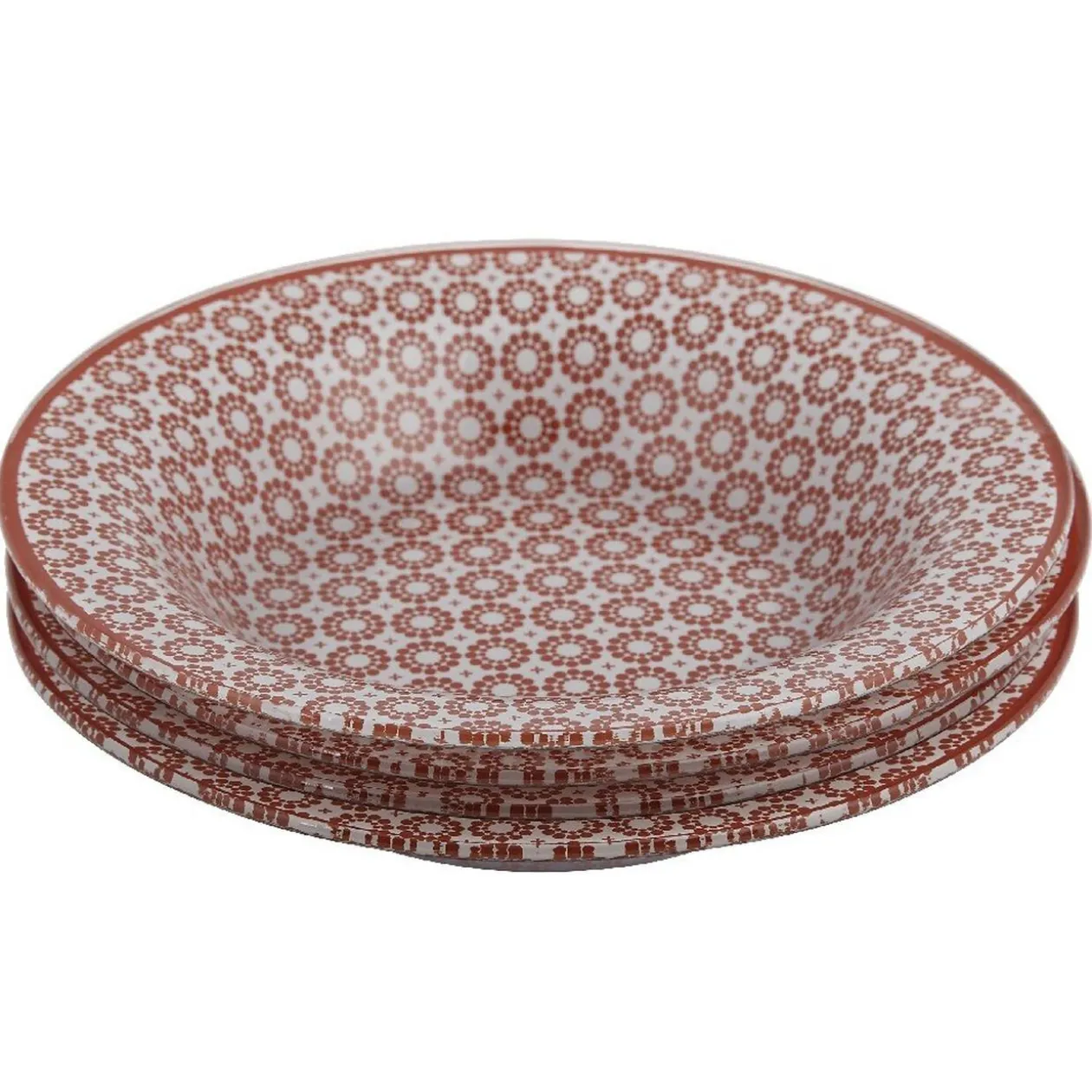4 assiettes creuses Micro blanches, motifs pois en forme de fleurs de couleur rouge.