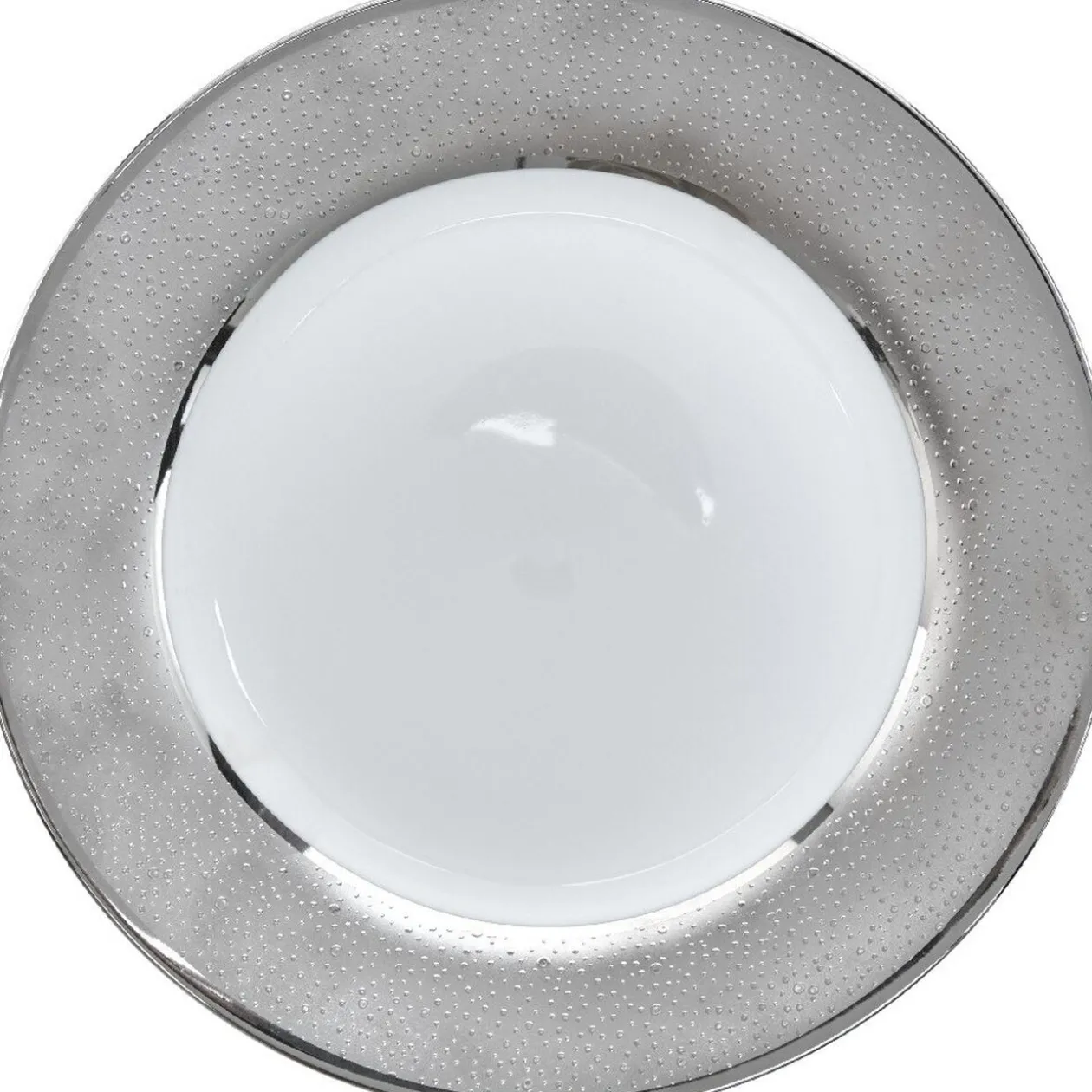 Assiette plate en porcelaine blanche au contour à l’effet texturé argenté.