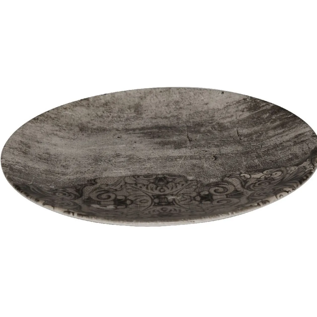 Alliez originalité et convivialité avec cette assiette plate ronde en céramique décor arabesque imitation vieux bois.