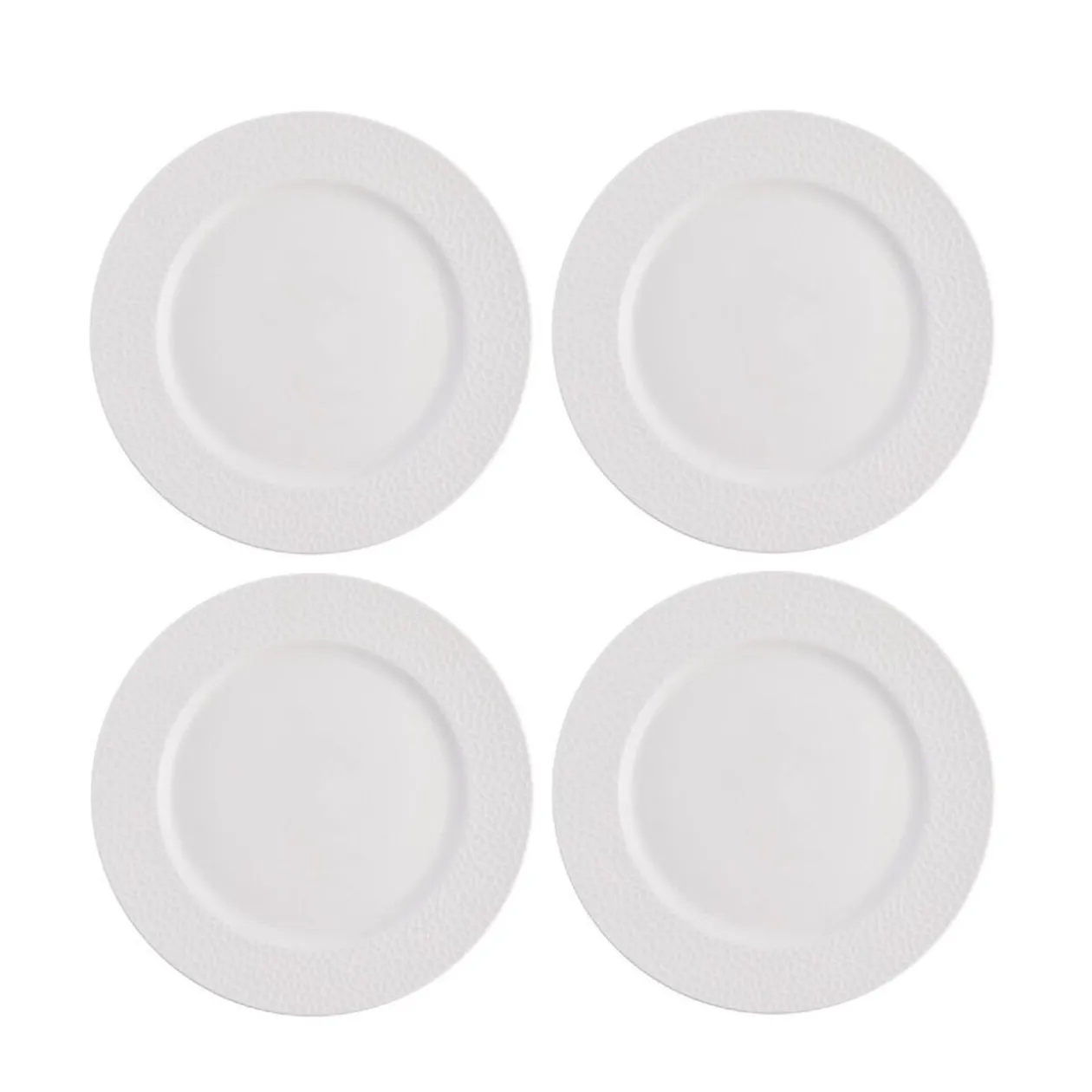 Lot de 4 assiettes plates en porcelaine rondes embossées de couleur blanche unie.