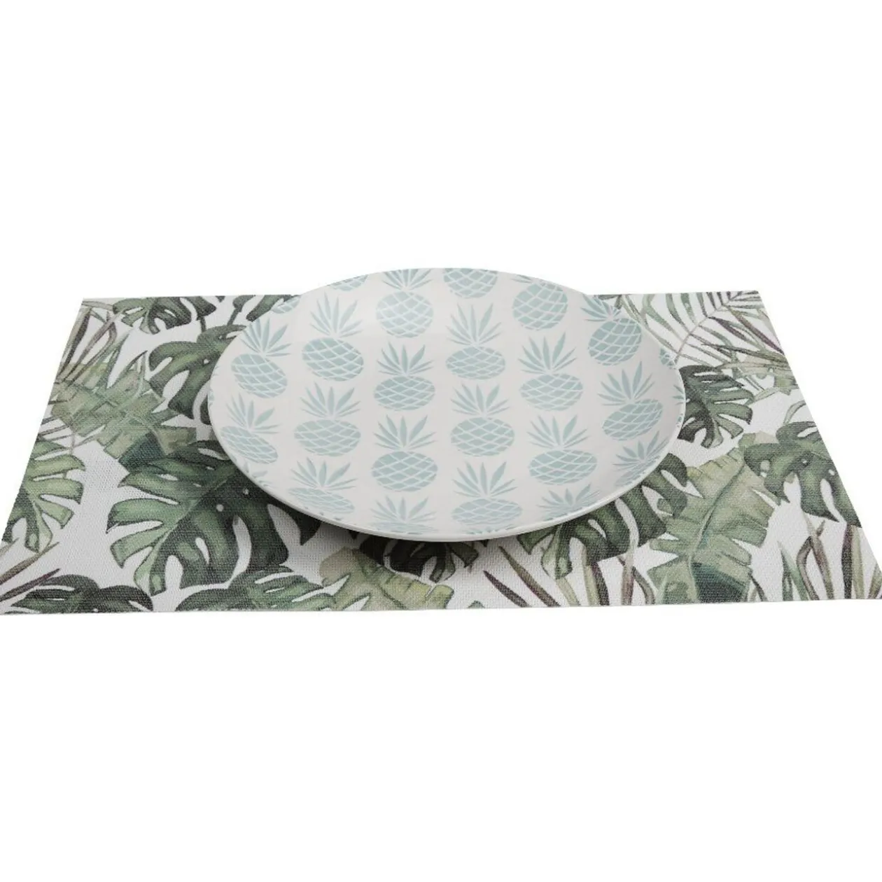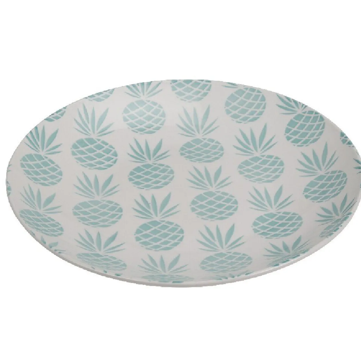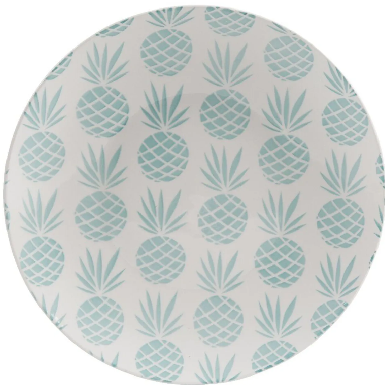 Assiette plate blanche en faïence de forme ronde avec motif ananas bleu clair. Découvrez sur notre site, l’assiette à dessert assortie !