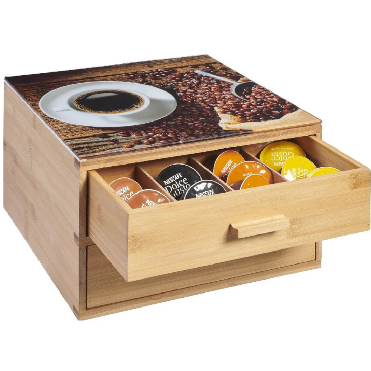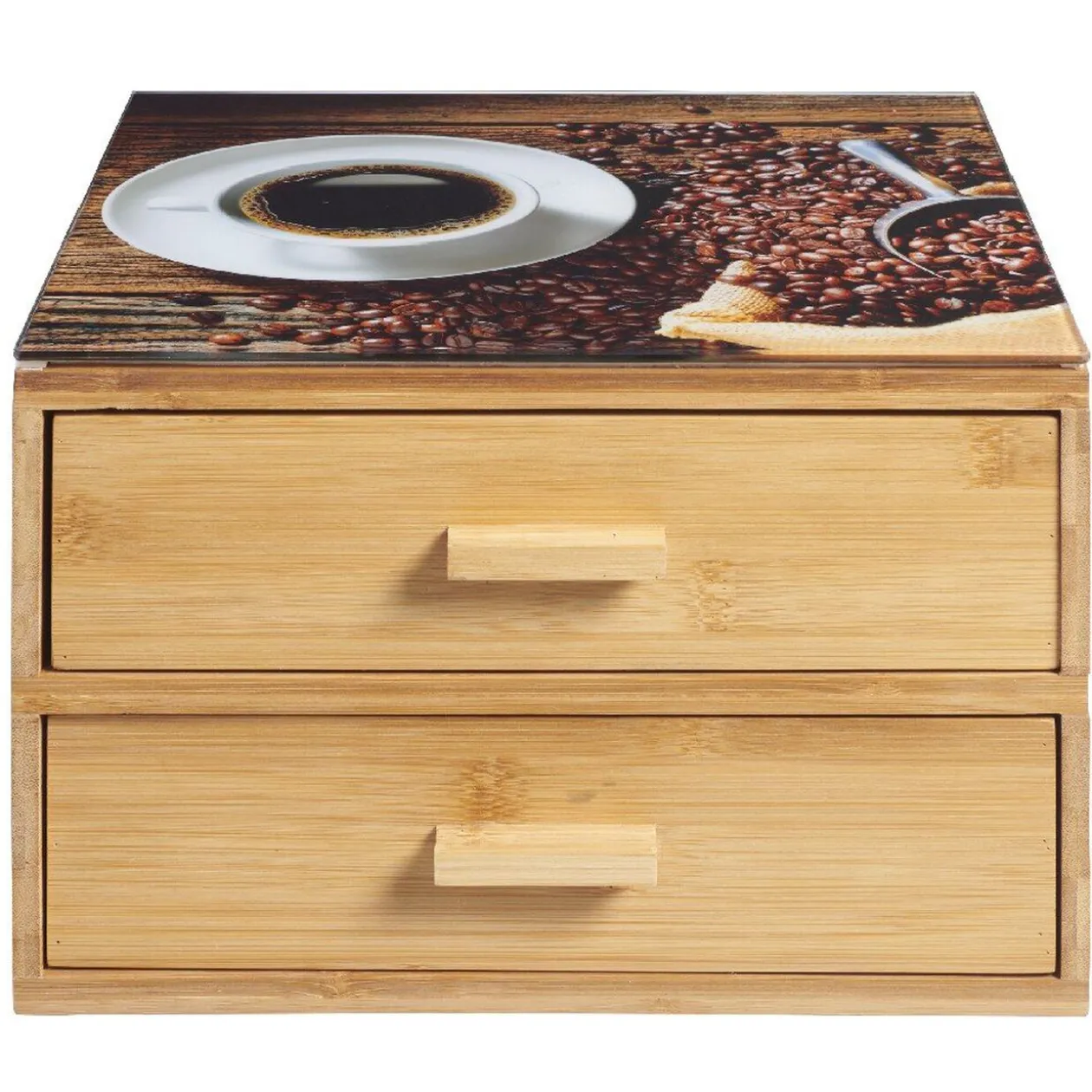 Optez pour ce range-dosettes à double tiroirs en bambou et plateau en verre design , déco et pratique pour poser votre cafetière dessus.