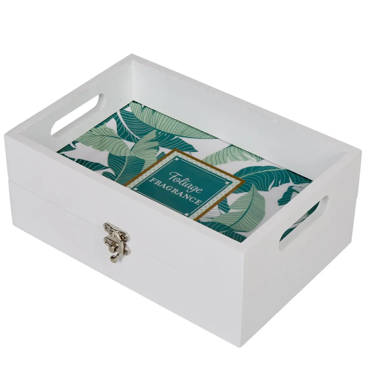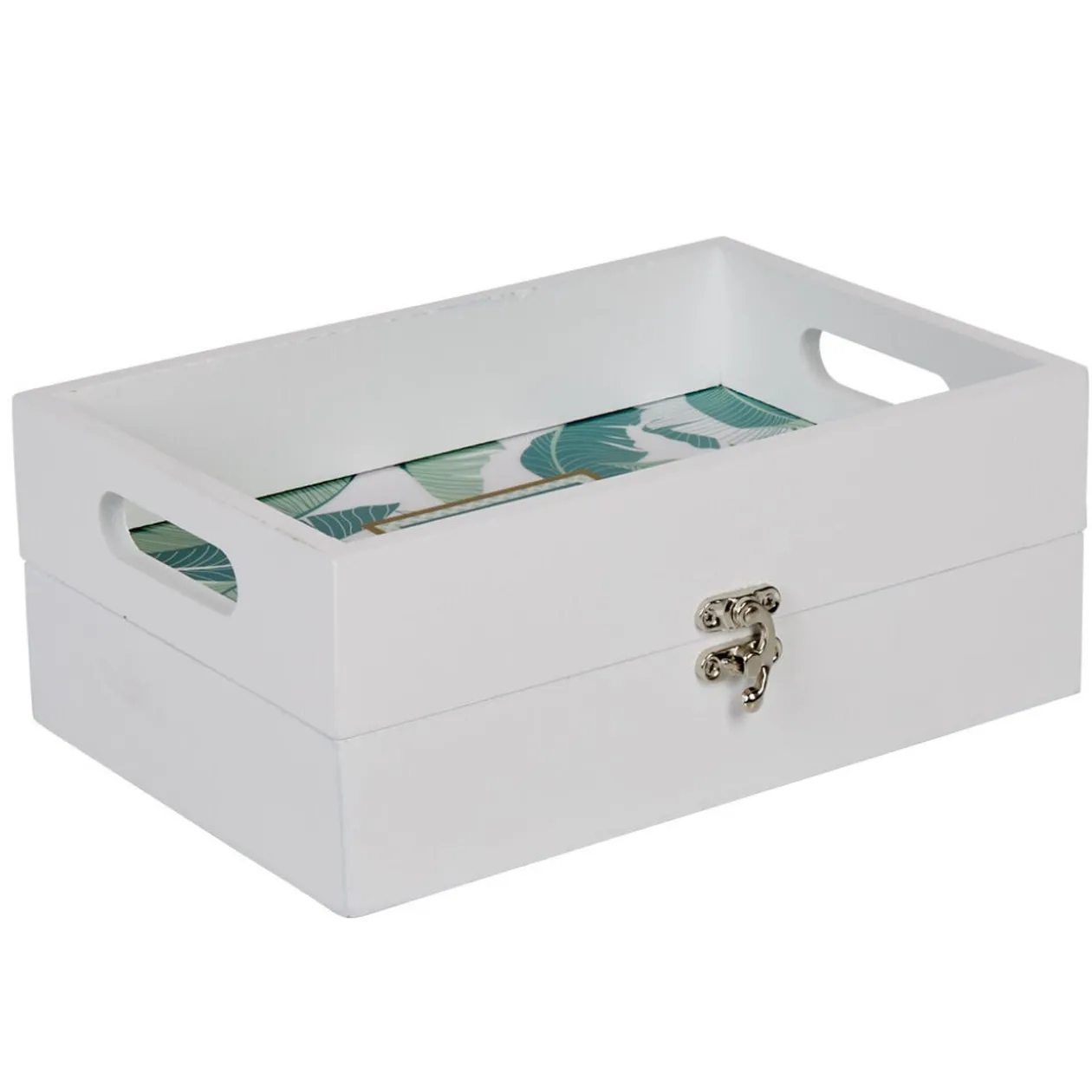 Boite blanche et design feuillage tropical.
