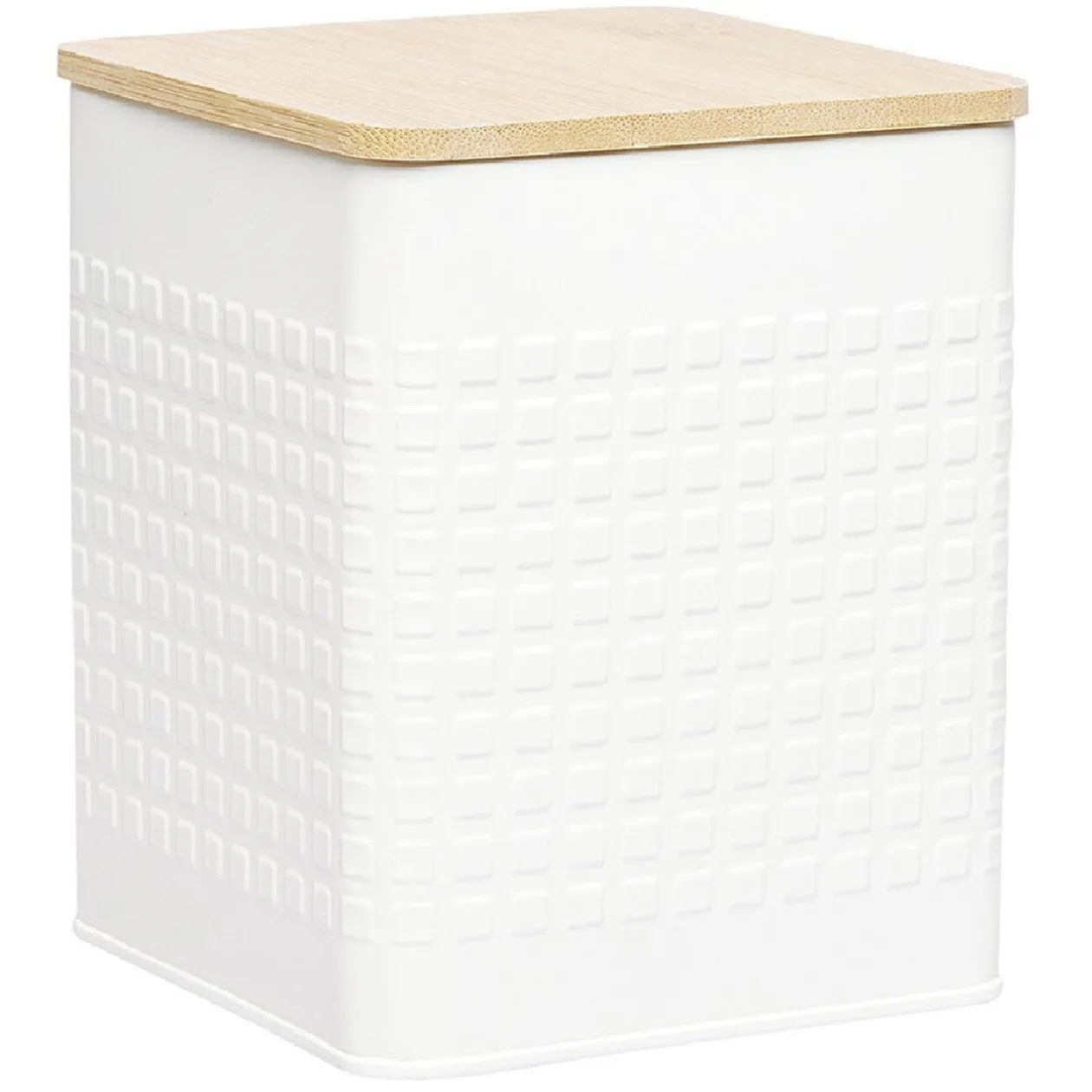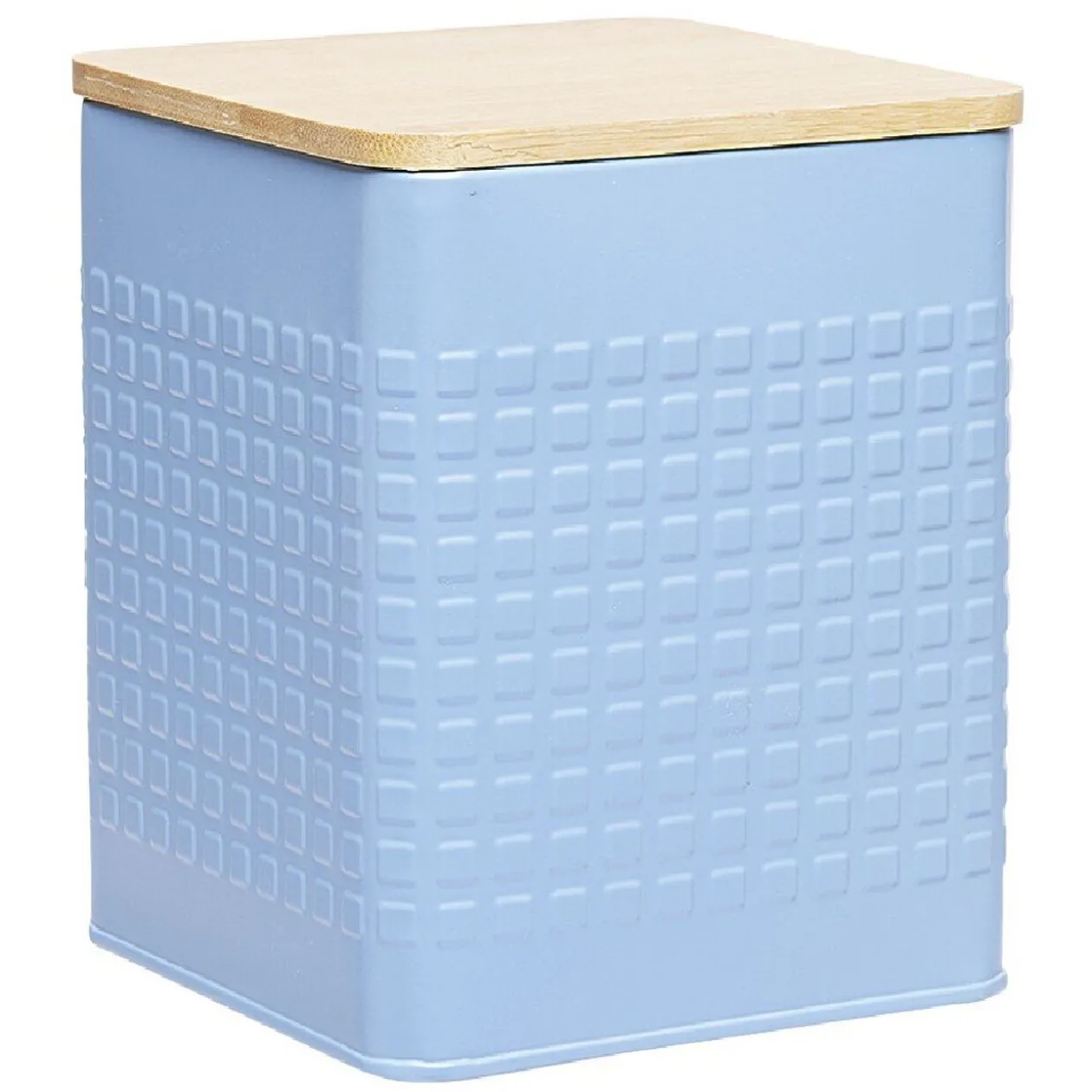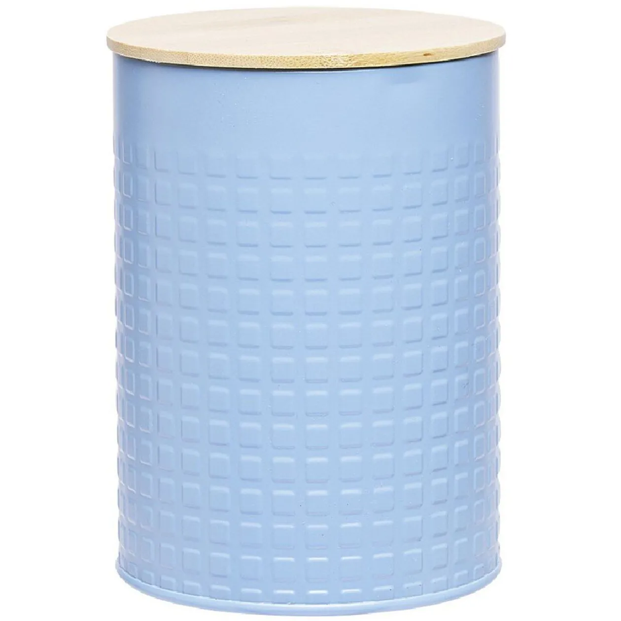Boîte ronde ou carrée – Dim. 11,5×11,5×14,5 cm ou Ø 11×11,5 cm, bambou, métal – Existe en bleu ou blanc