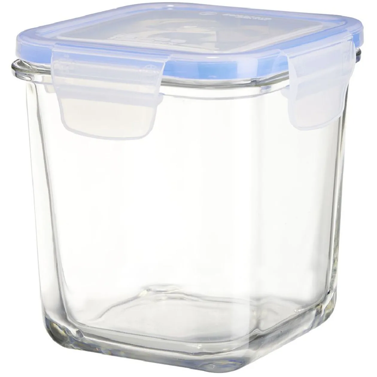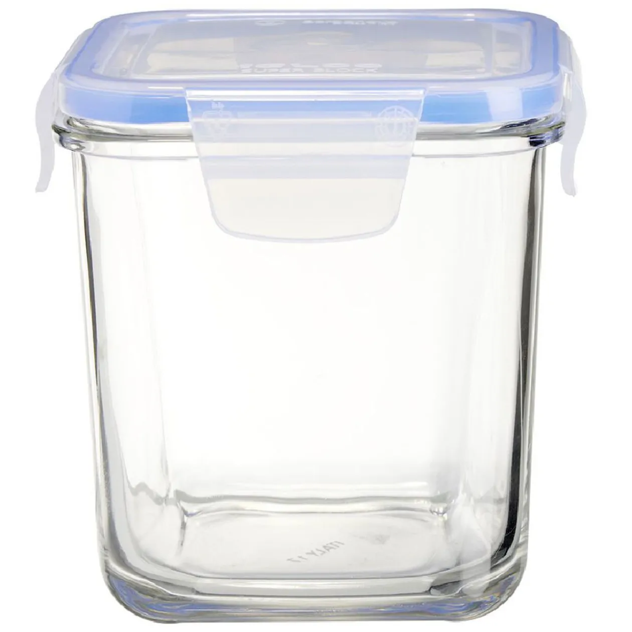 Boîte de conservation rectangulaire en verre transparent avec couvercle en plastique à fermeture clips.