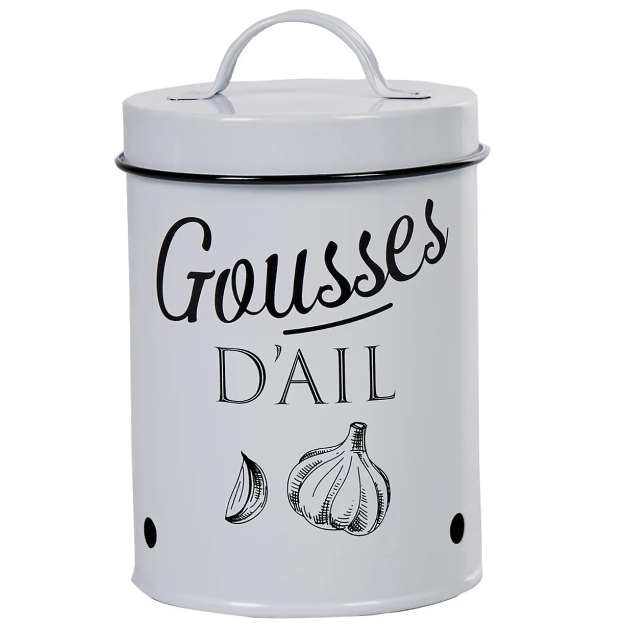 Boîte de conservation de style vintage en métal blanc avec inscription « gousses d’ail » de couleur noire.
