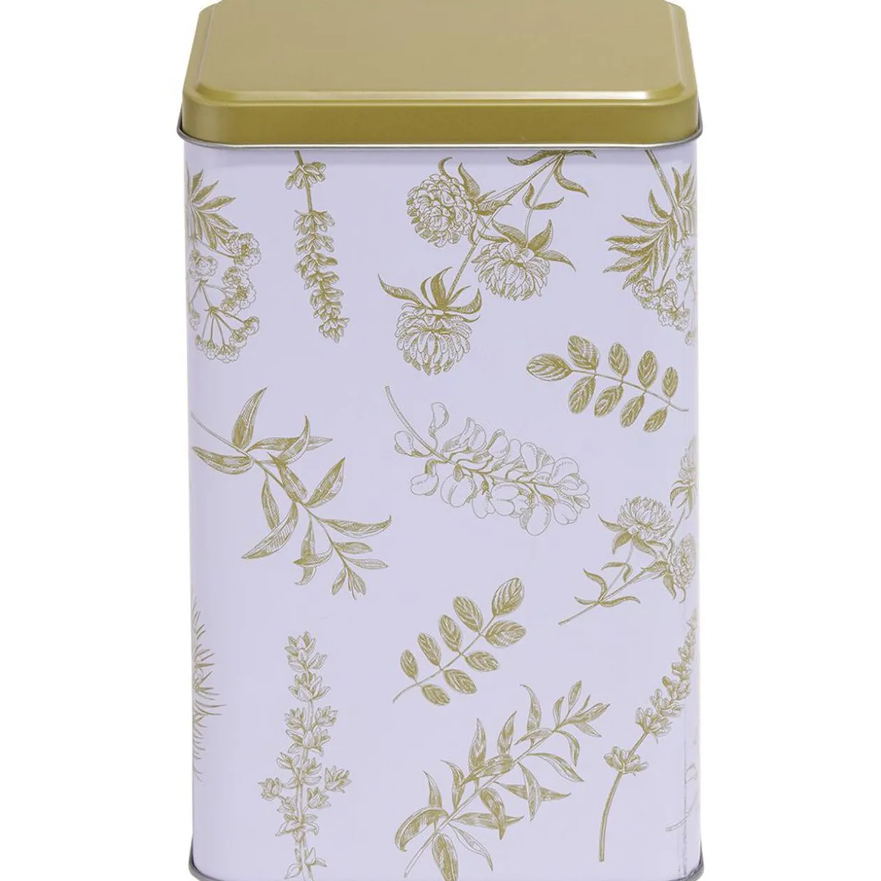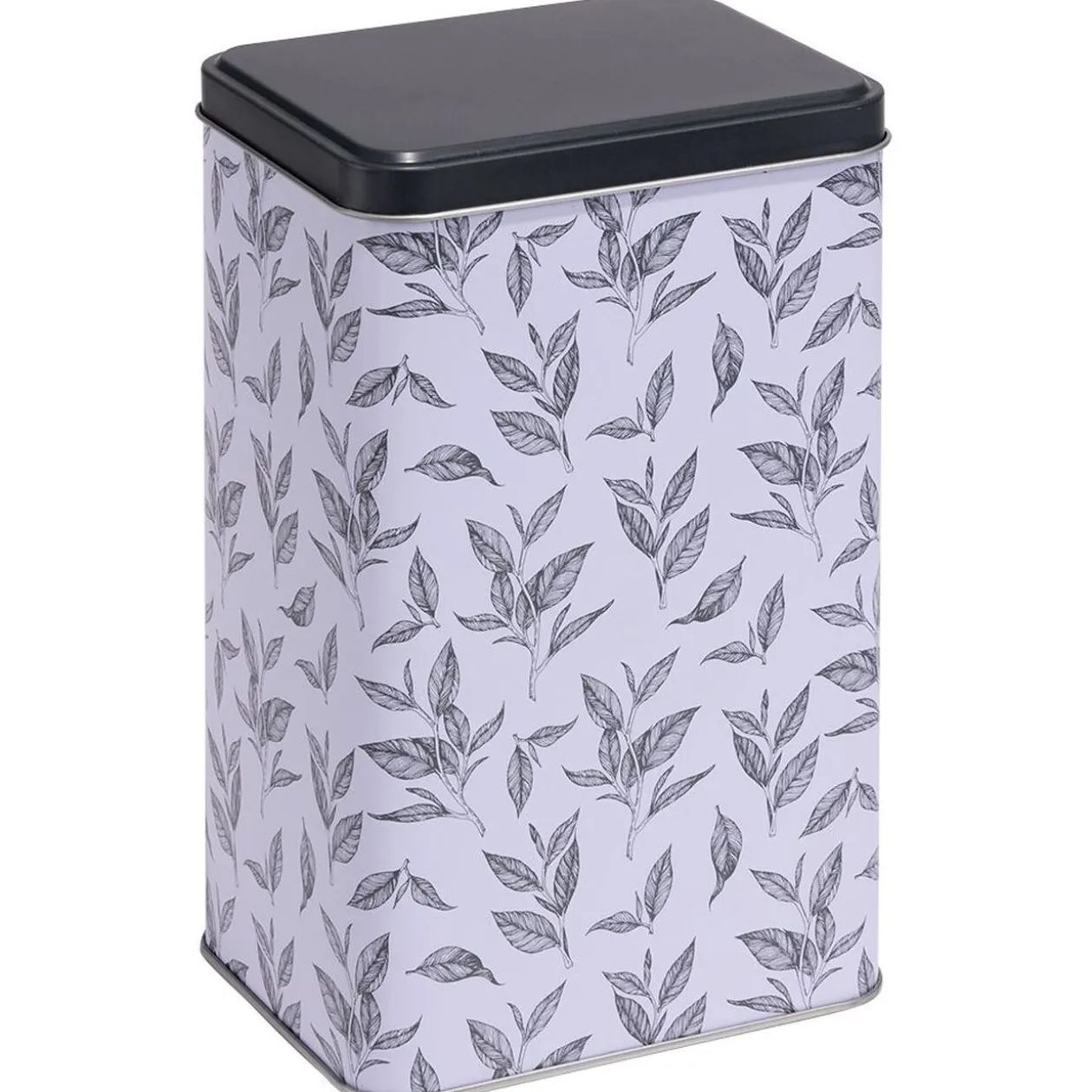 Boîte en métal blanc avec imprimé feuillage de couleur assorti au couvercle.