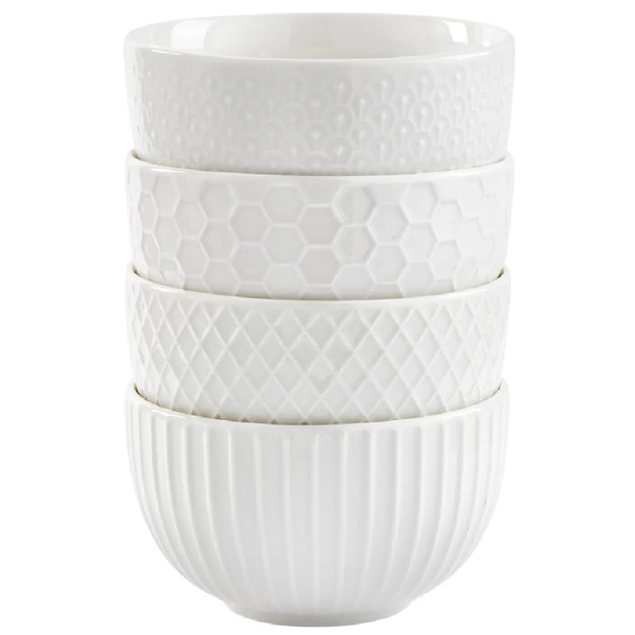Ces 4 bols blancs embossés seront parfaits pour passer un petit-déjeuner en famille ! Fabriqués en porcelaine blanche, ils affichent un look minimaliste et s’accorderont sans effort avec votre vaisselle, quel que soit son style ou sa couleur. Vous pourrez également vous en servir comme récipient pour vos gâteaux apéritifs à l’occasion de votre repas de fête à Noël.
