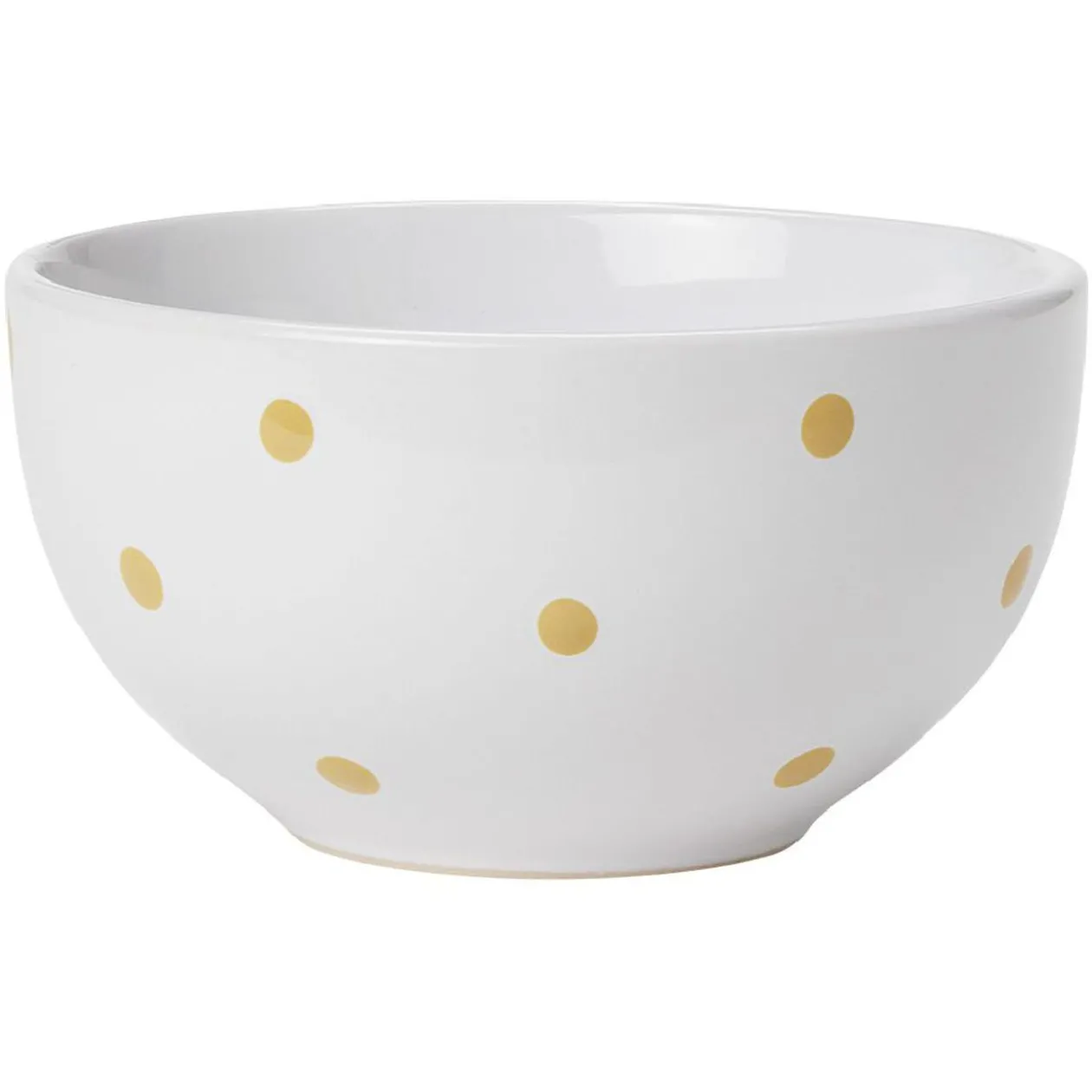 Set de 4 bols en faïence blanche avec motif pois de couleur beige, bleu, jaune et corail.