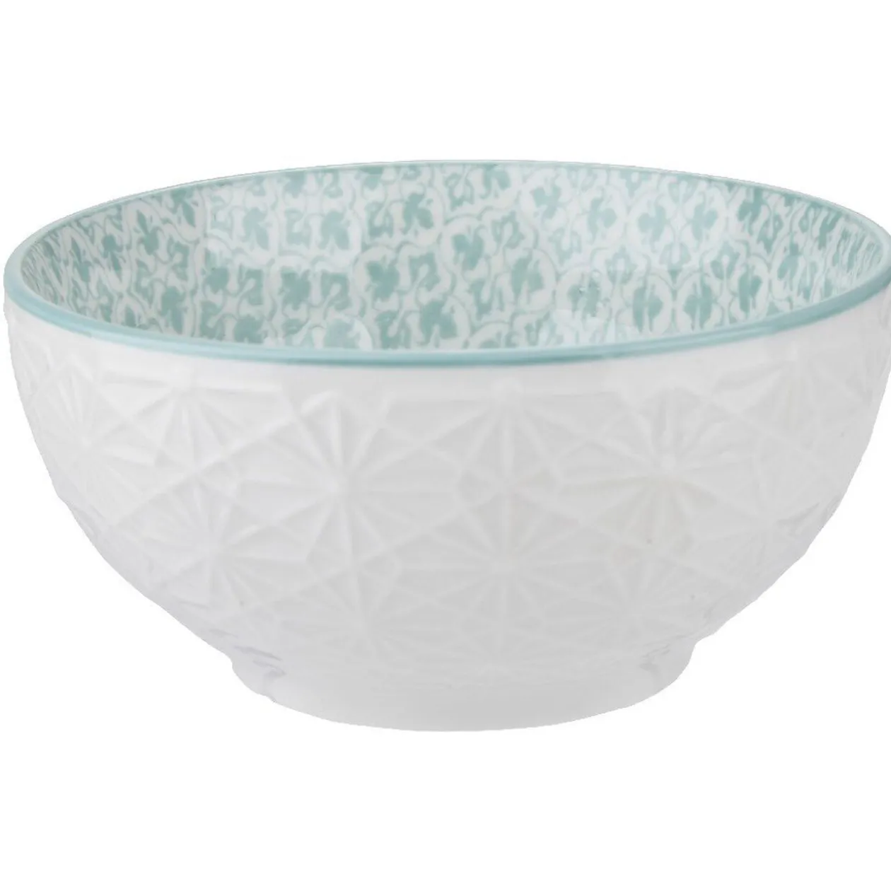 Lot de 4 japonais en porcelaine avec motifs géométriques similaires et couleurs pastels différentes pour chacun des bols : un rouge, un vert, un bleu, un jaune.