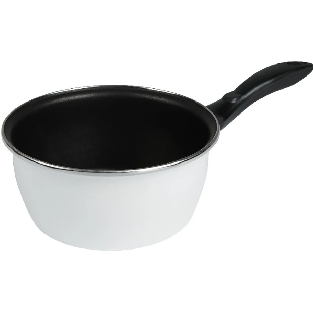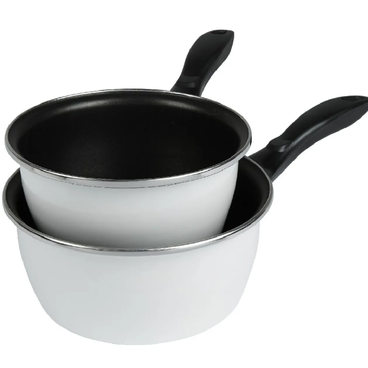 Lot de 2 casseroles en acier émaillé avec revêtement antiadhésif et poignée isolée par un manche en bakélite.