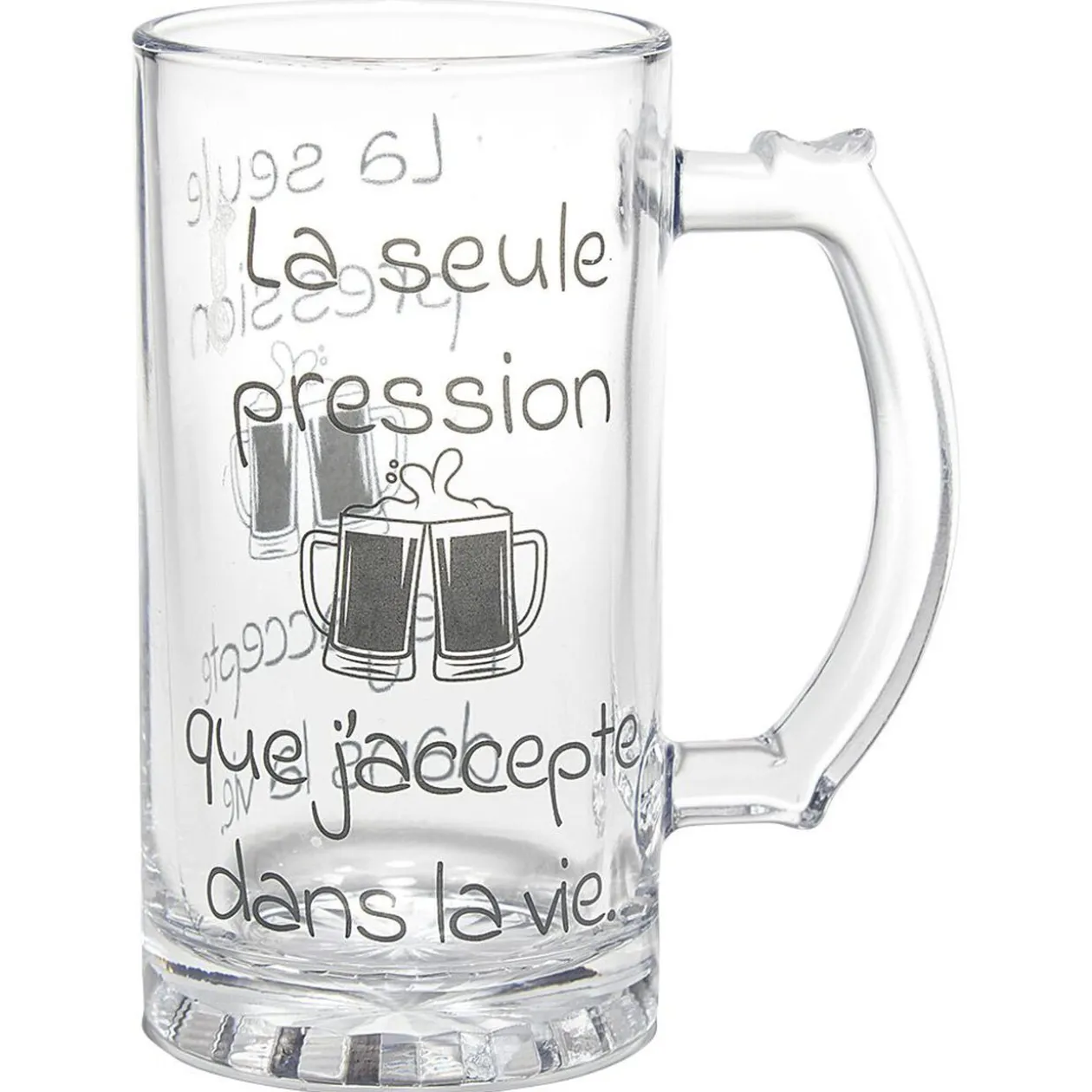 Chope à bière en verre transparent avec inscription noire.