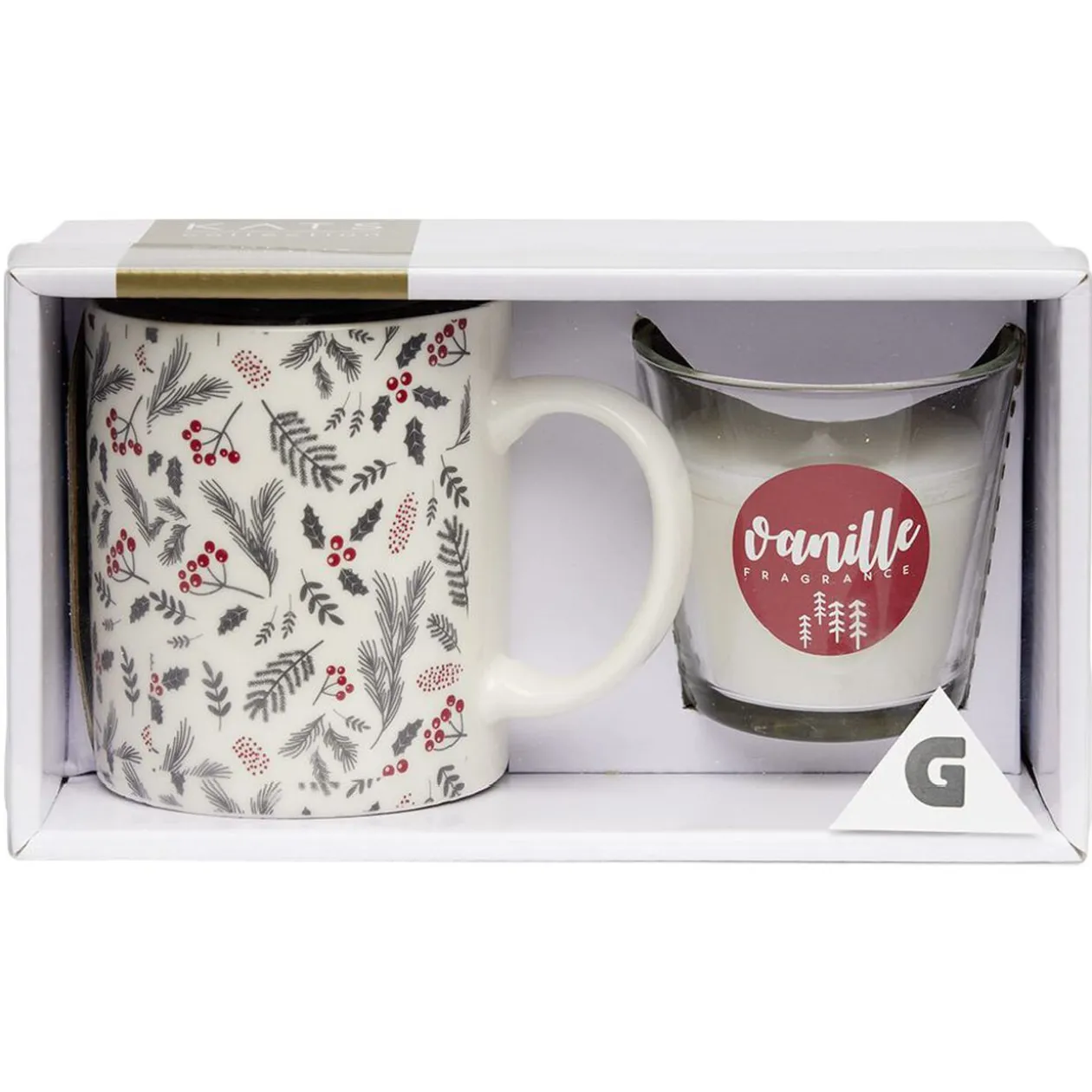 Coffret cadeau avec bougie parfumée dans verre et mug en porcelaine assorti.