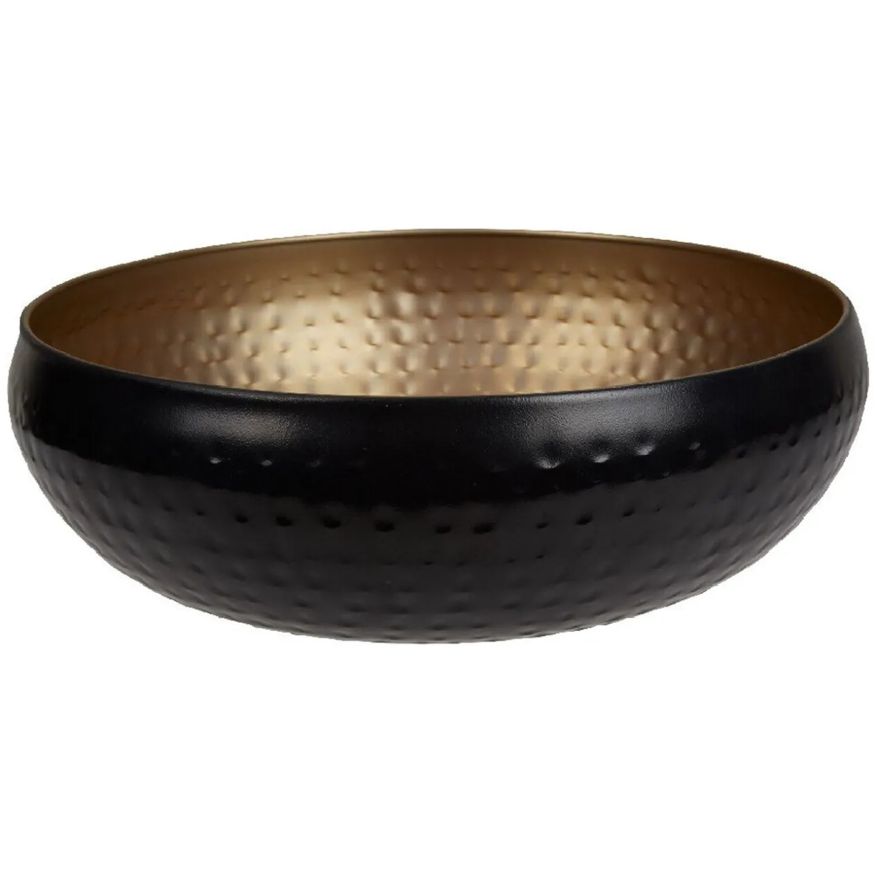 Très jolie corbeille à fruits ronde en acier de couleur noire à l’extérieur et dorée à l’intérieur.