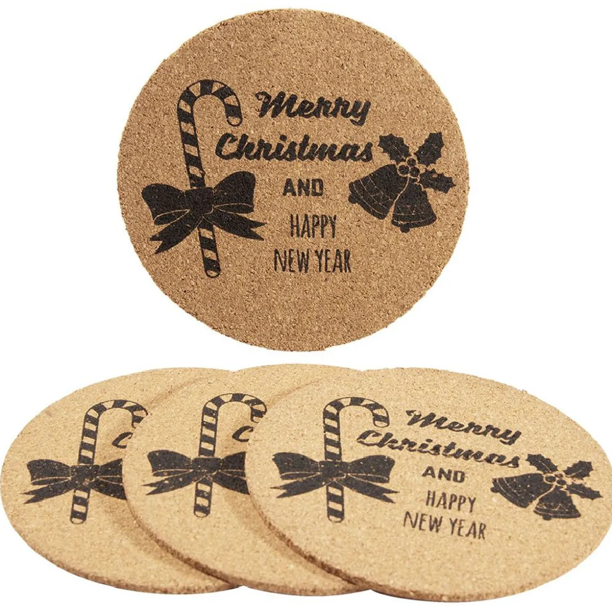 Lot de 4 dessous de verre en liège avec motifs et inscriptions sur le thème de Noël.