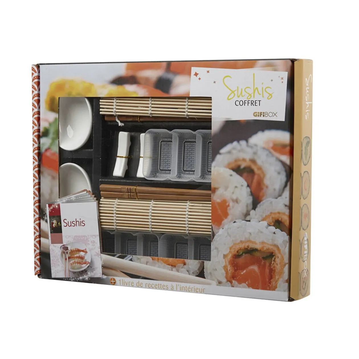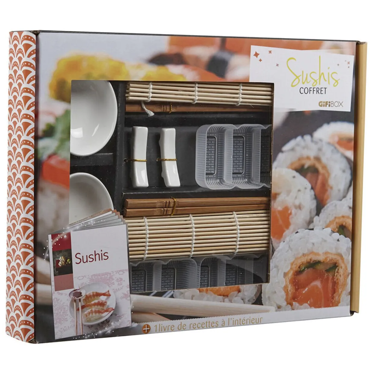 Retrouvez dans ce coffret cadeau tout le matériel nécessaire pour réaliser et déguster des sushis et makis dans la pure tradition. Les nattes en bambou ainsi que les godets fournis vous permettront de confectionner vos sushis rapidement et facilement. Avant de vous lancer, découvrez les techniques de réalisation dans le livre de recette joint (éditions Hachette).Le coffret cadeau Sushis contient: 2 nattes à rouler, 3 moules à sushis, 2 repose-baguettes en céramique, 2 paires de baguettes, 2 coupelles en céramique et 1 livre de recettes.Les GiFi Box sont des coffrets cadeaux sur des thématiques variées: culinaire mais aussi l’art de recevoir, le bien-être, les loisirs… Découvrez vite toute la gamme des .