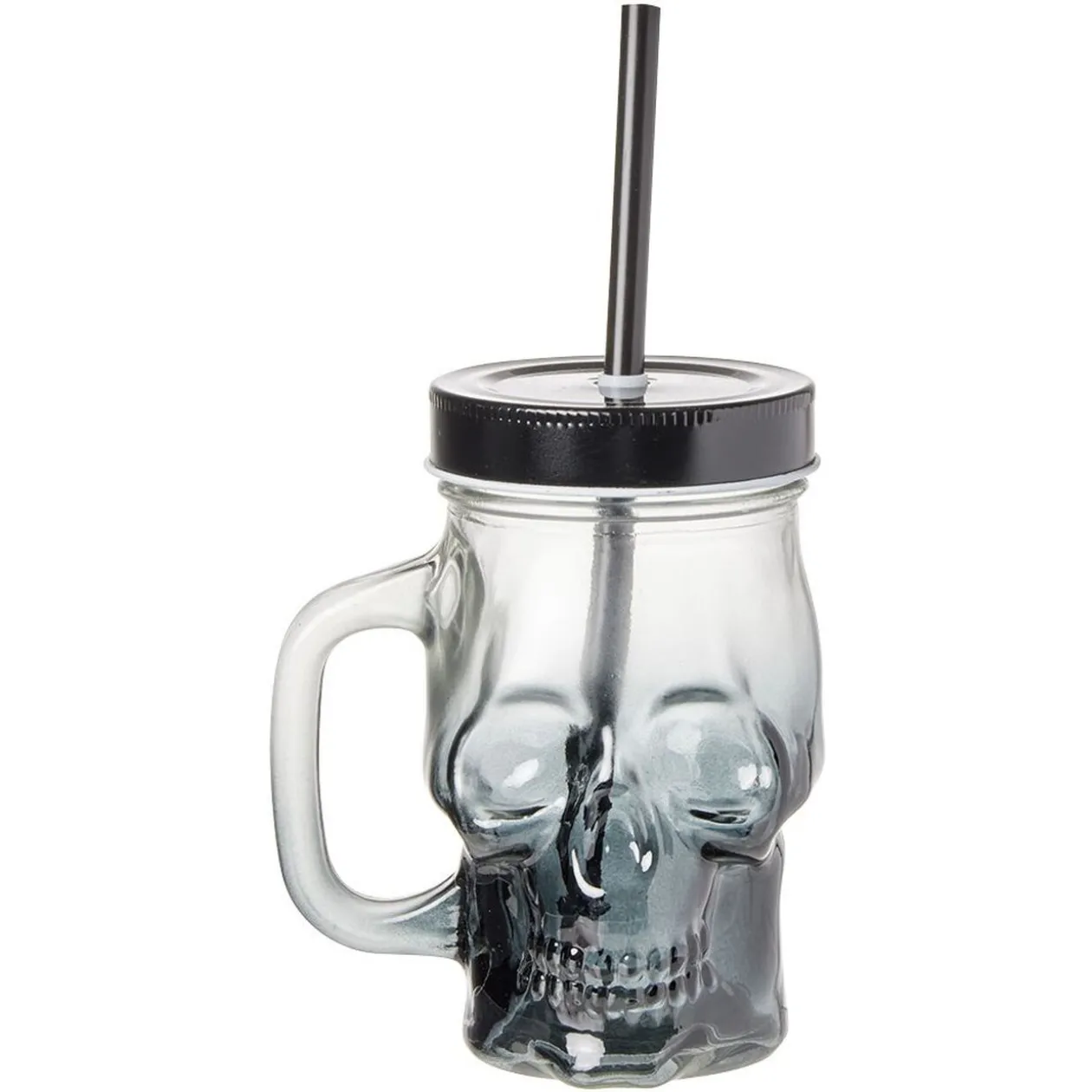Gobelet en verre en forme de tête de mort avec couvercle et paille. Terriblement original à l’occasion de Halloween !