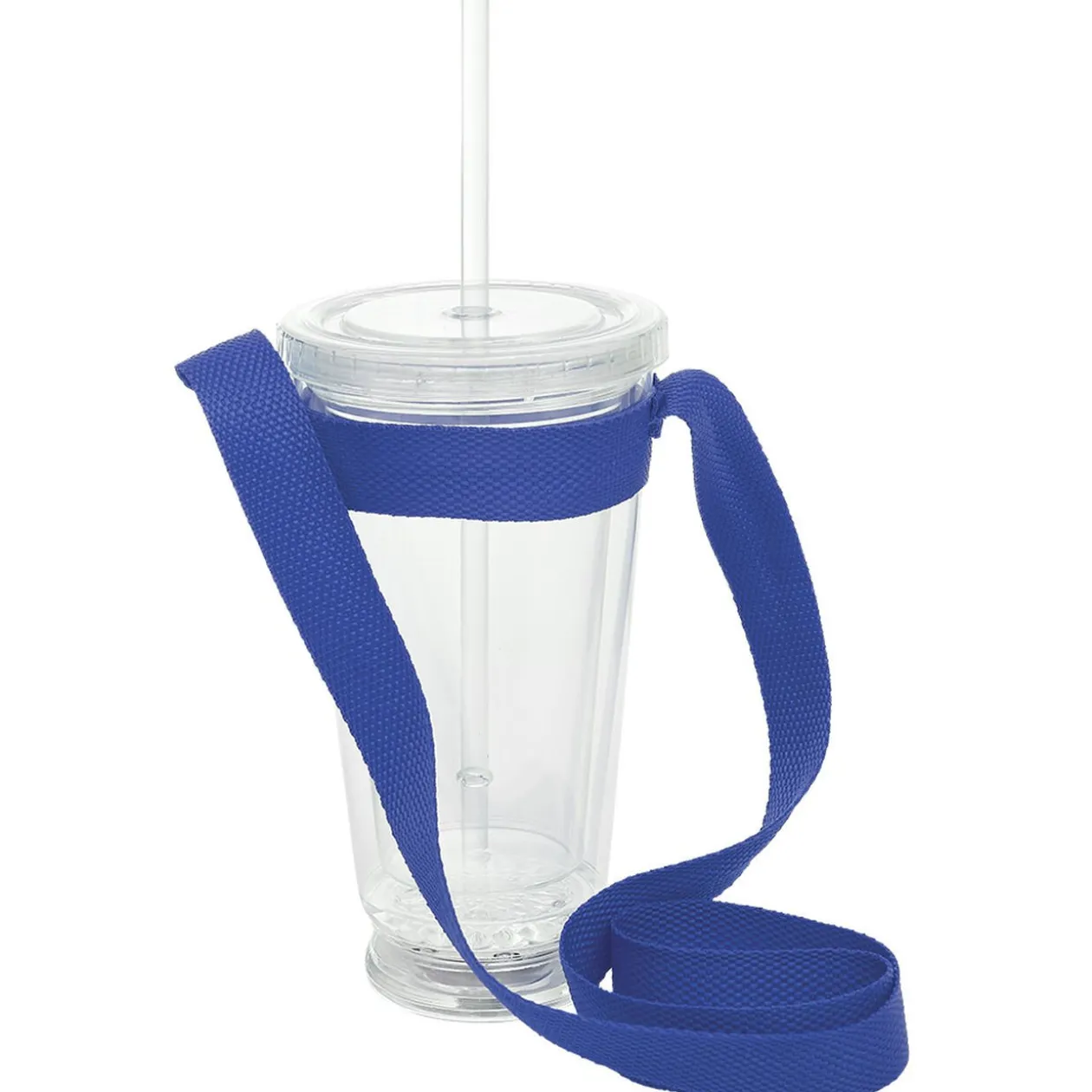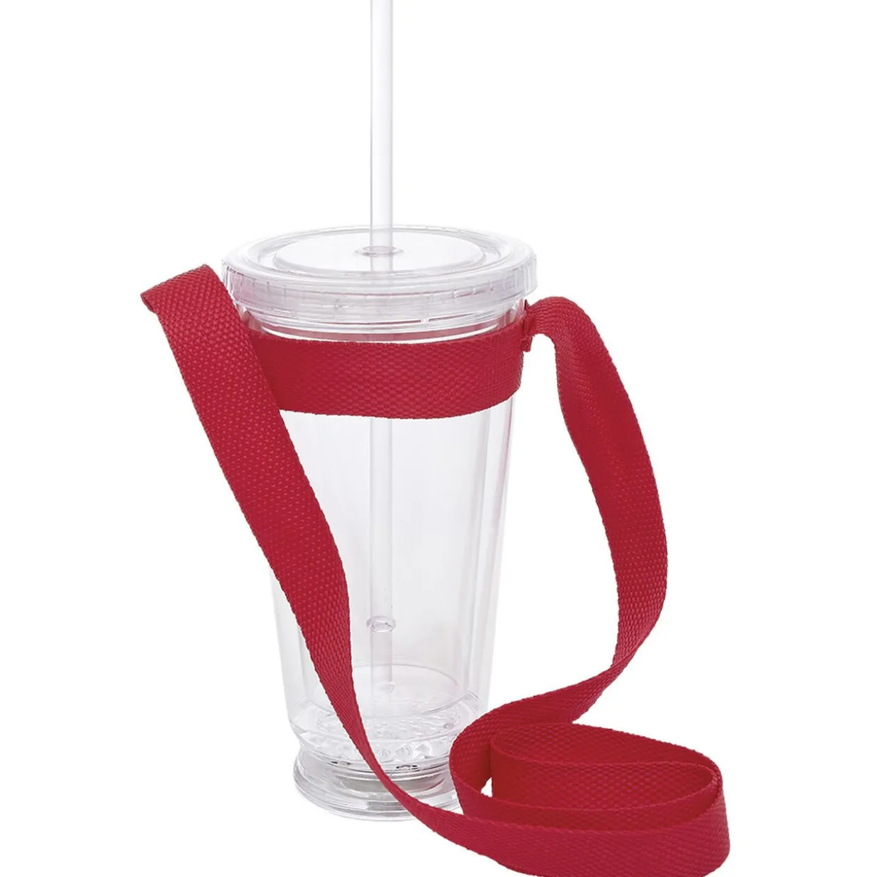 De par sa lanière bleue ou rouge, transportez facilement votre gobelet avec vous et buvez rapidement grâce à sa paille incluse.