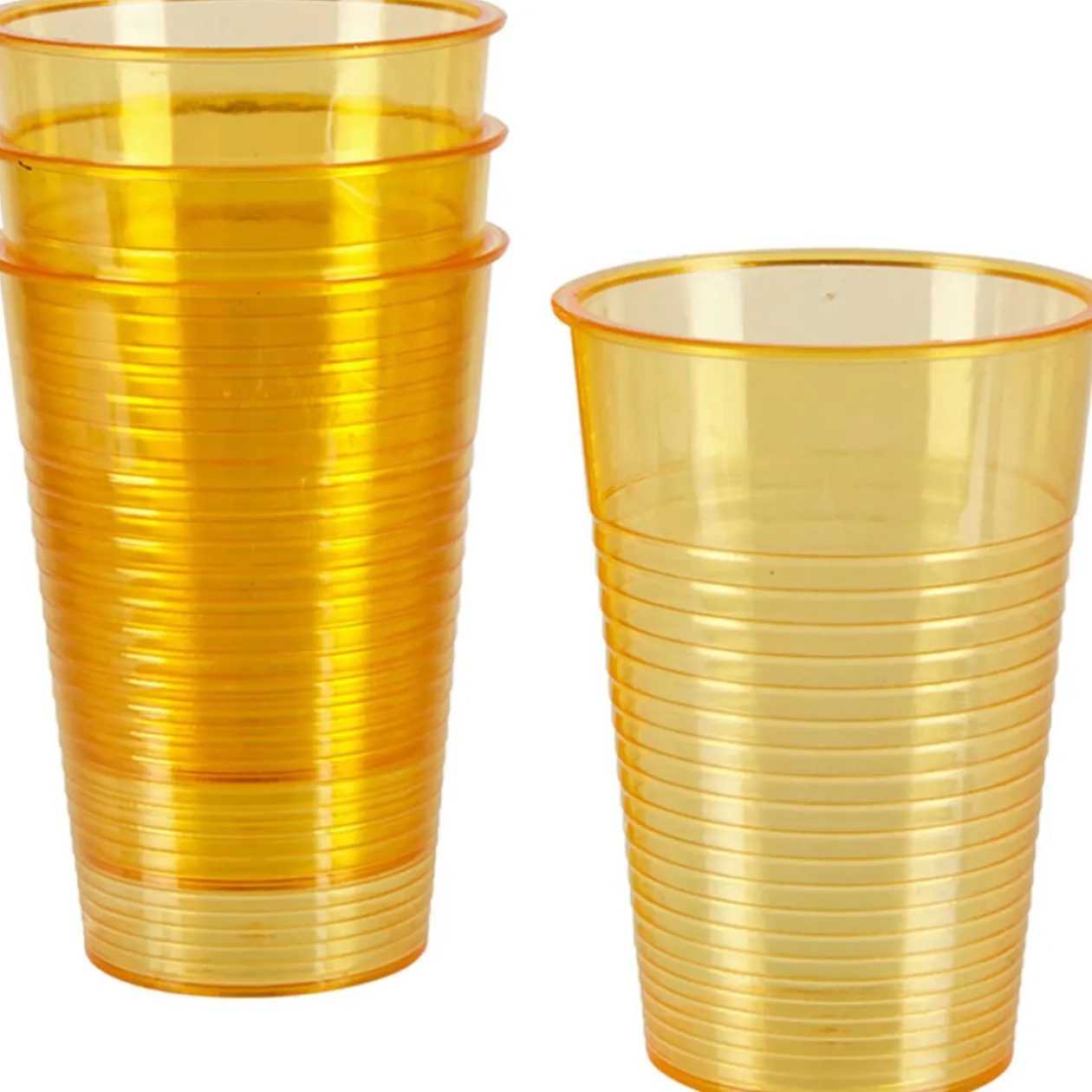 4 gobelets en plastique orange transparent, cont. 20 cl, dim. 10×7 cm.