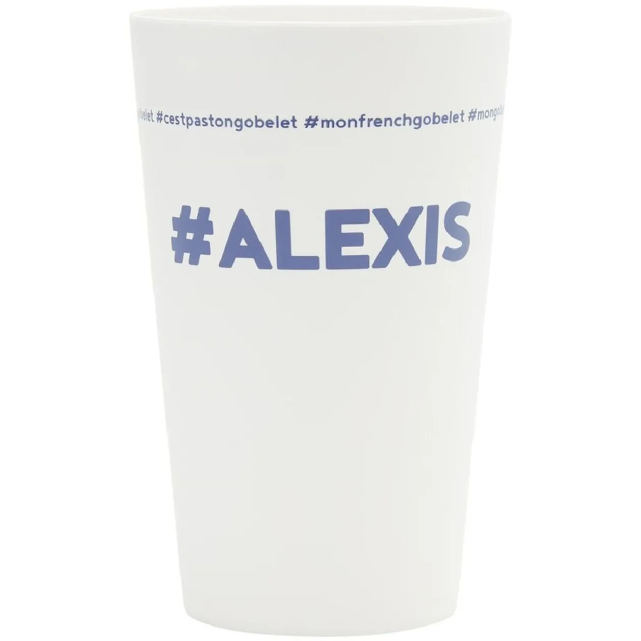 Gobelet réutilisable en plastique blanc avec inscription bleue #ALEXIS.