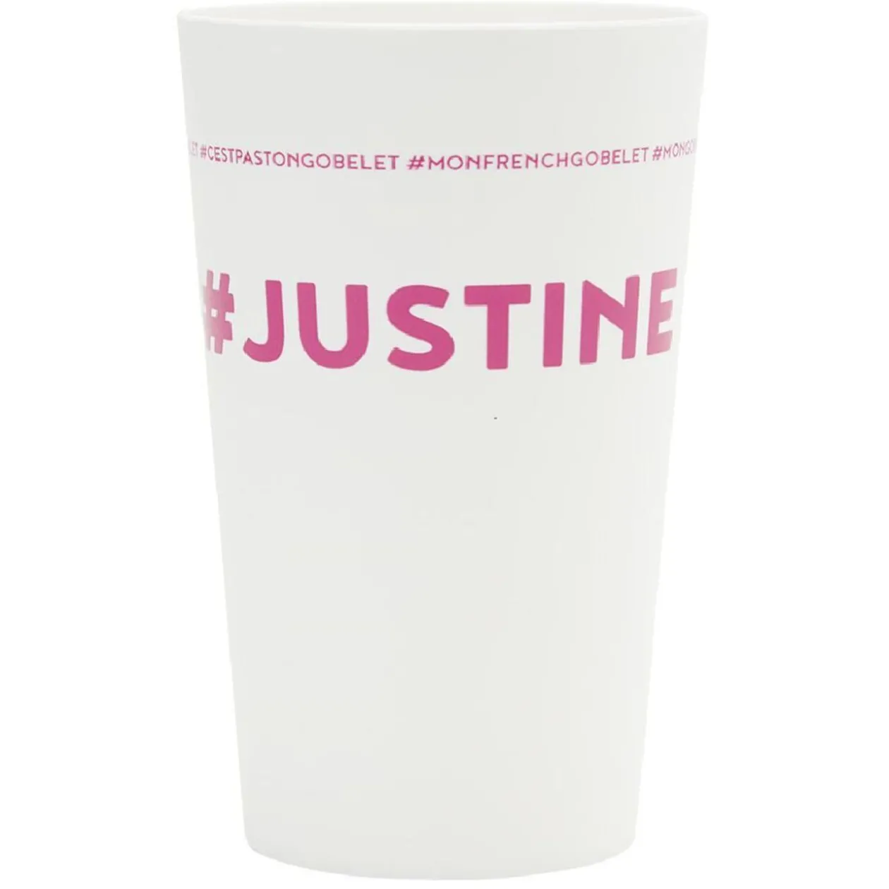 Gobelet réutilisable en plastique blanc avec inscription rose #JUSTINE.