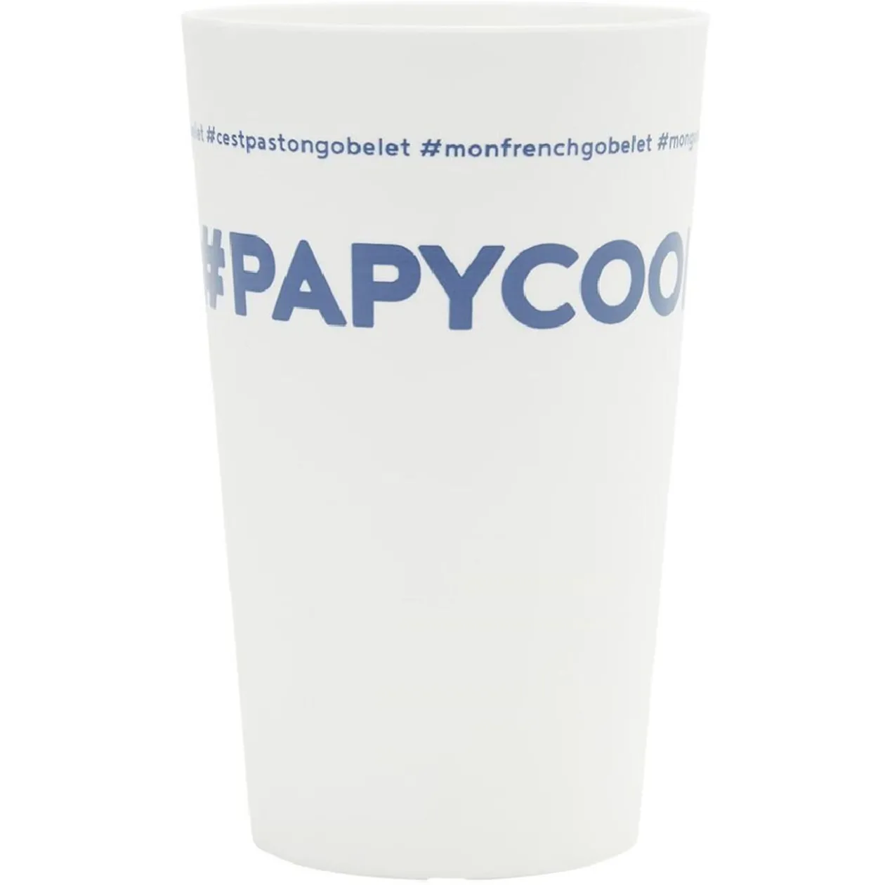 Gobelet réutilisable en plastique blanc avec inscription bleue #PAPYCOOL.