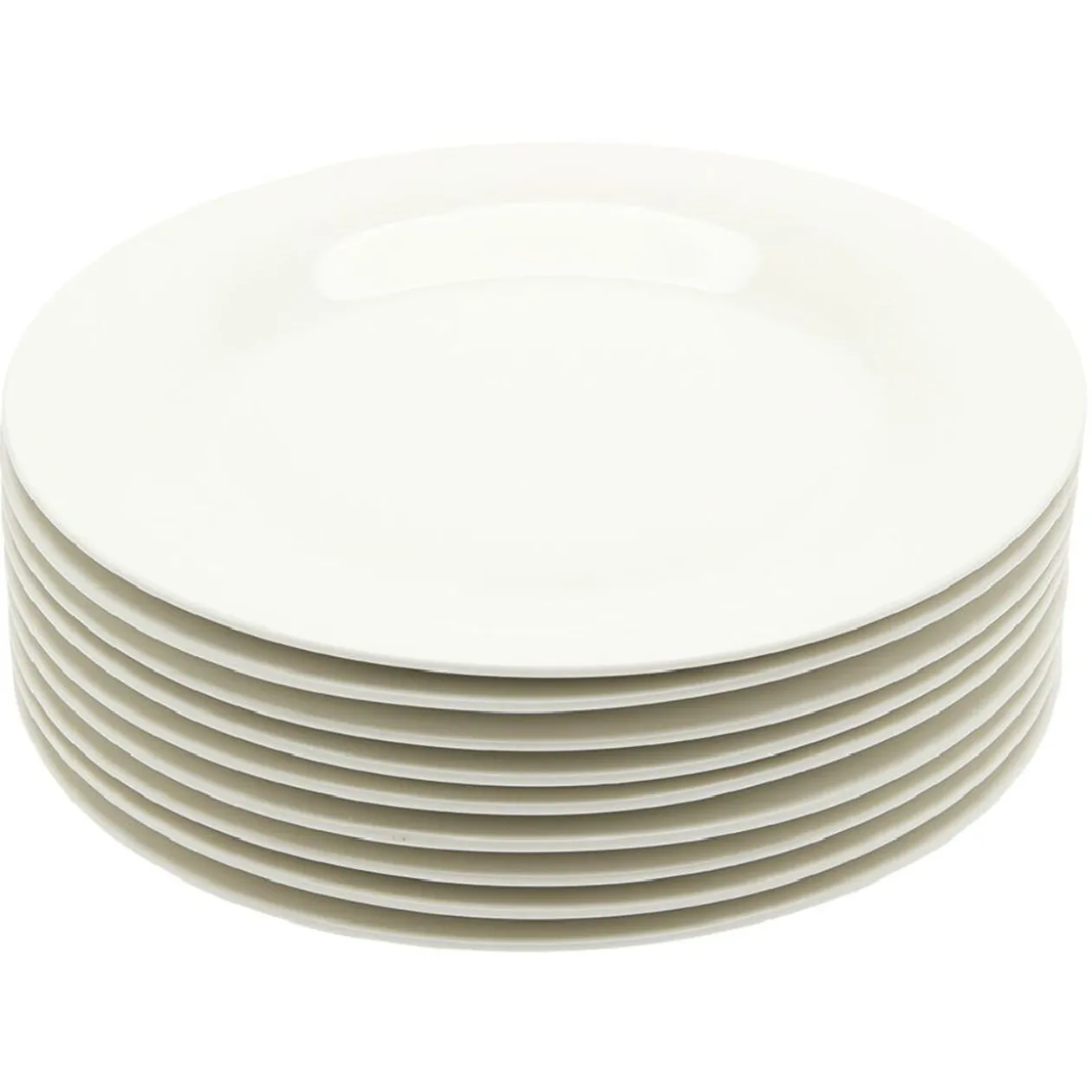 Lot de 10 assiettes plates au style neutre uni blanc.