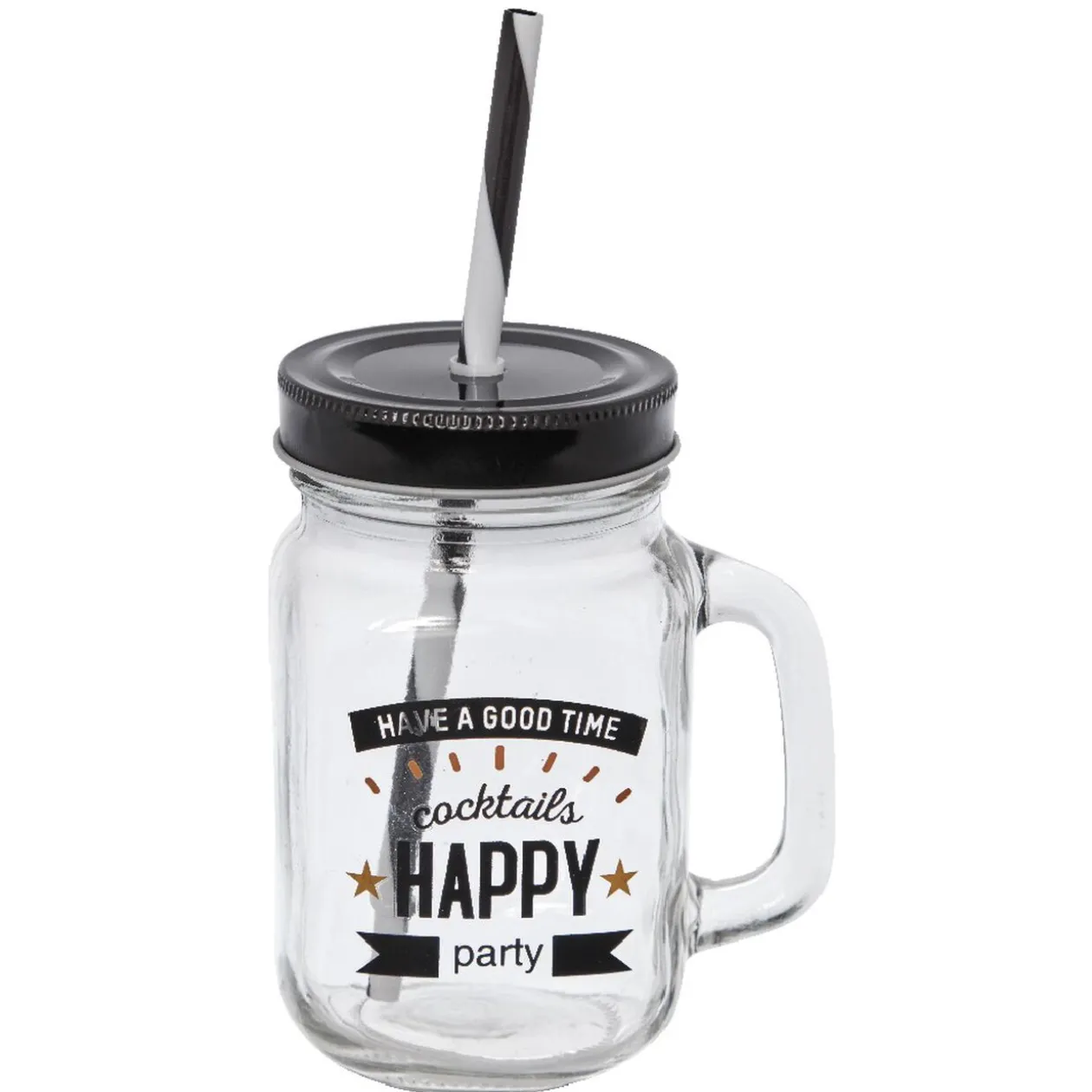 Passez un bon moment entre amis avec ces bocaux à anse. Le design joyeux de ce mason jar avec l’inscription « Happy », son couvercle et sa paille noire et blanche à rayures mettra en valeur toutes vos boissons. Facilitez votre service avec le support qui se transporte partout. Servez de bons chocolats chauds pour l’hiver ou de bons cocktails pour un après-midi ensoleillé.