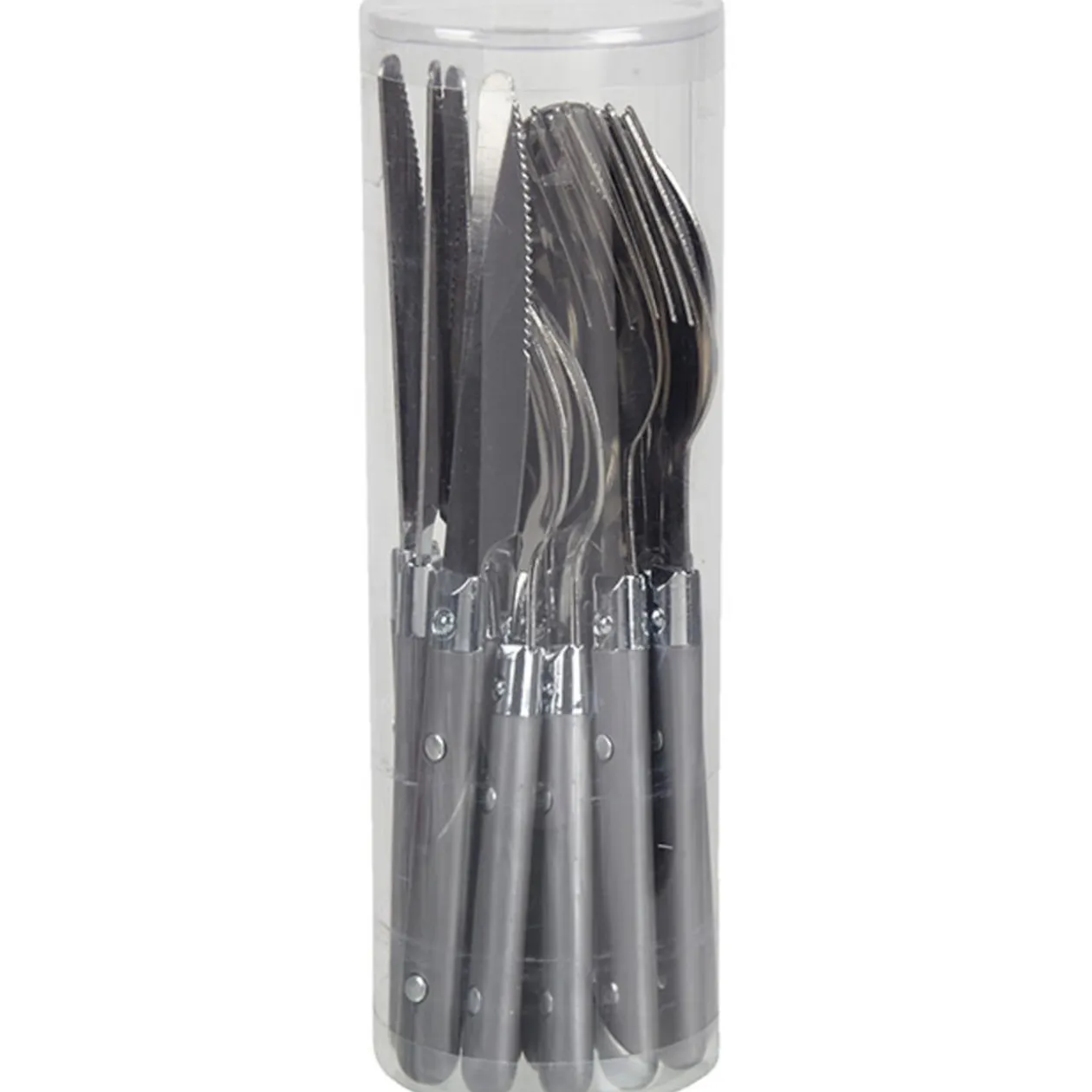 Ménagère 16 pièces gris comprenant 4 fourchettes, 4 cuillères à soupe, 4 couteaux et 4 cuillères à café, inox, manche plastique.