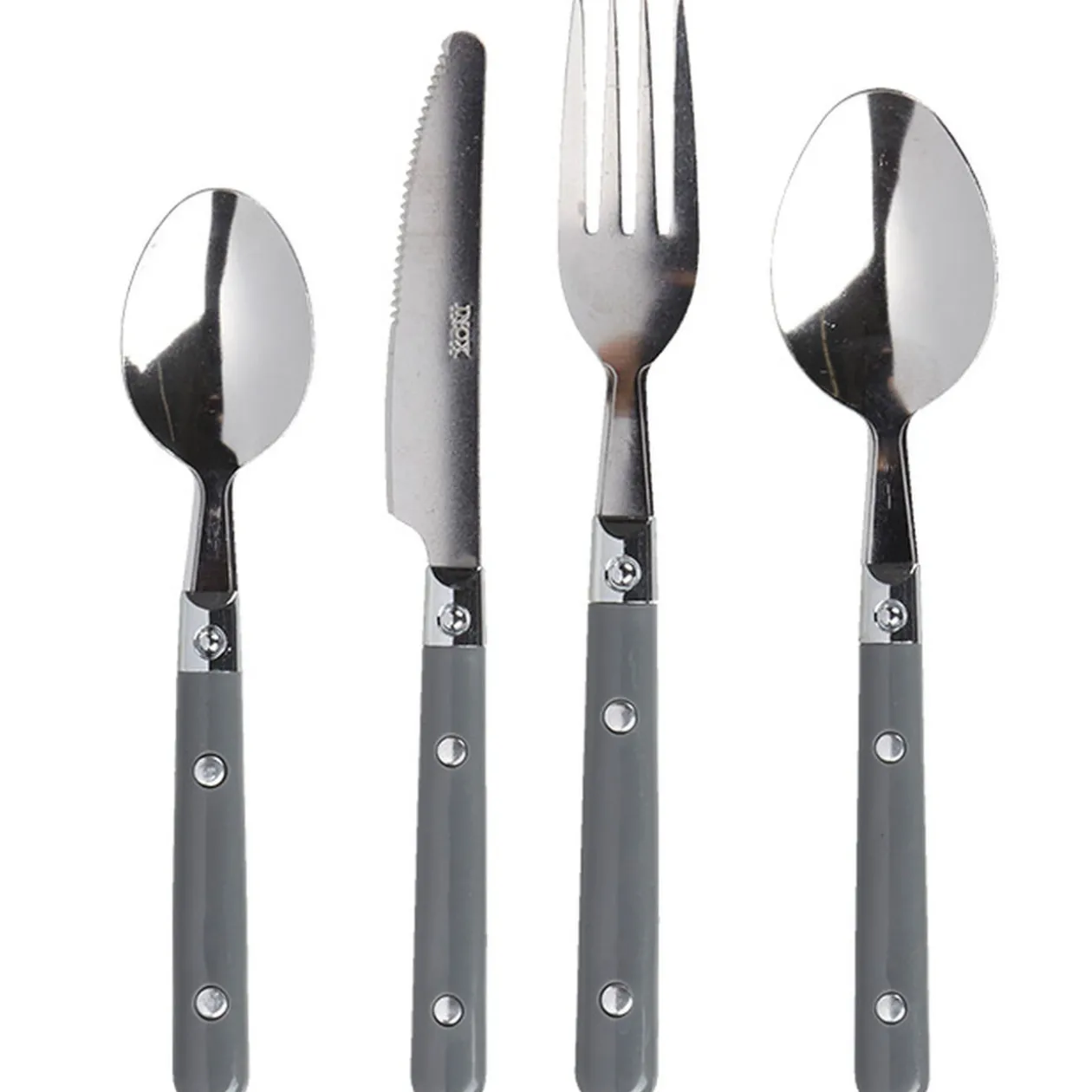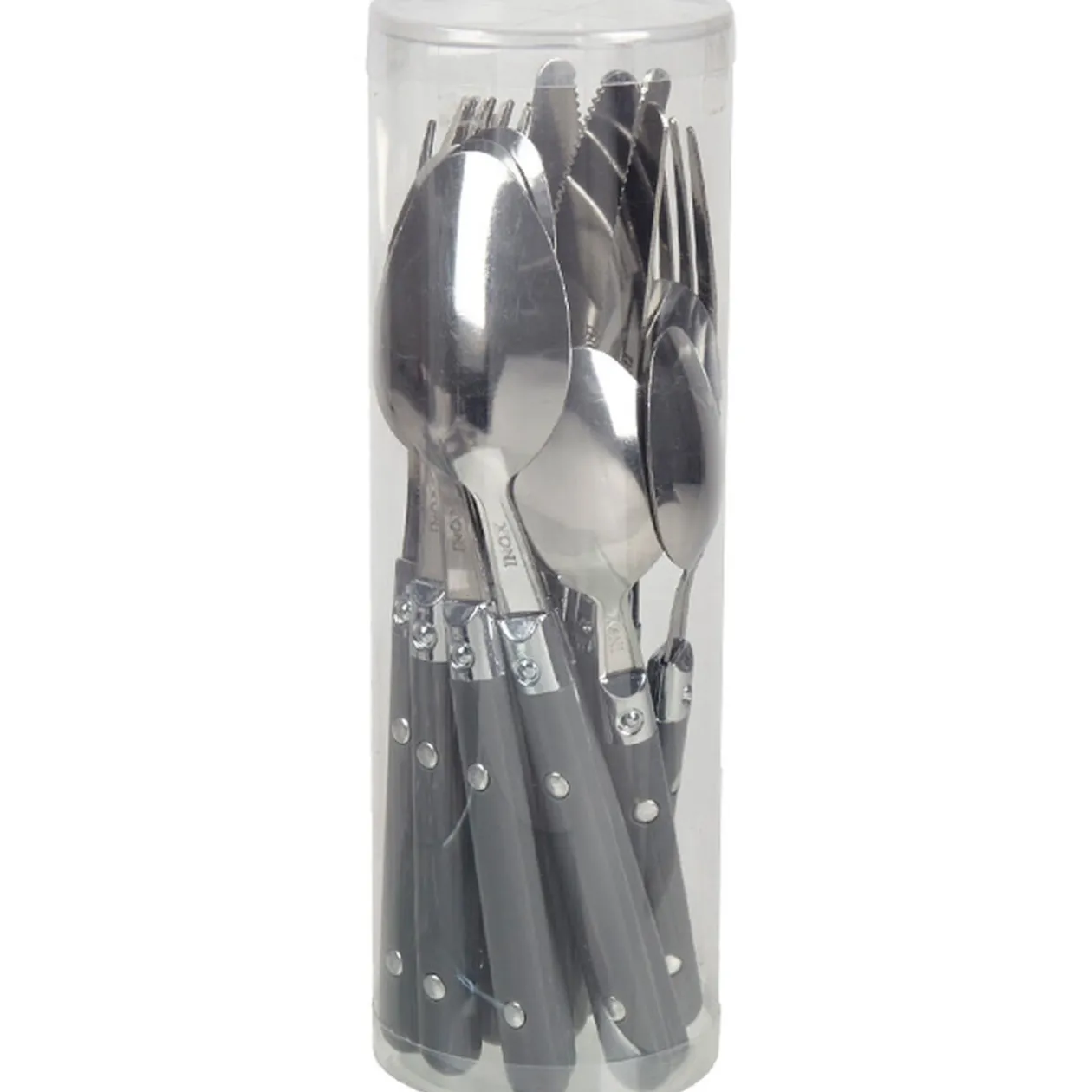 Ménagère composée de 16 couverts en inox avec manche en plastique de couleur grise.