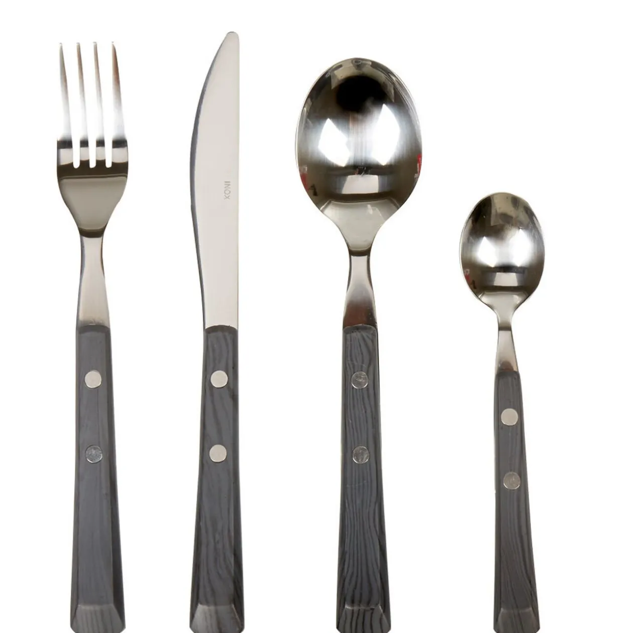 Ménagère 16 pièces manche effet bois gris foncé, inox et manche plastique.