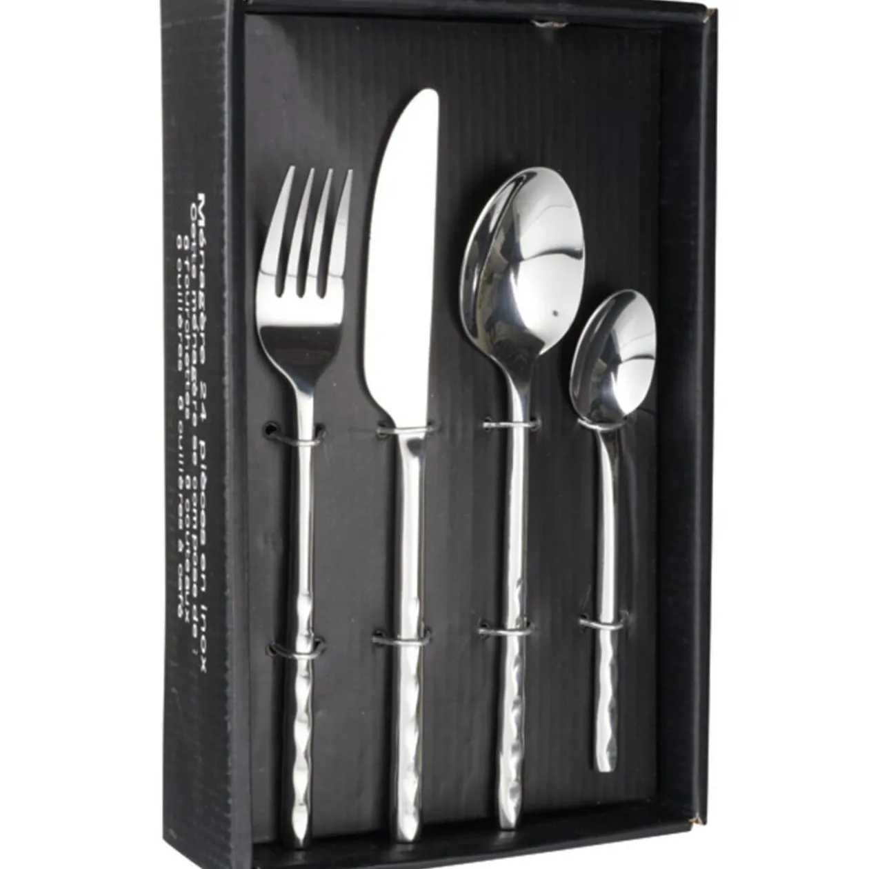 Ménagère 24 pièces inox comprenant 6 fourchettes, 6 cuillères à soupe, 6 couteaux et 6 cuillères à café.