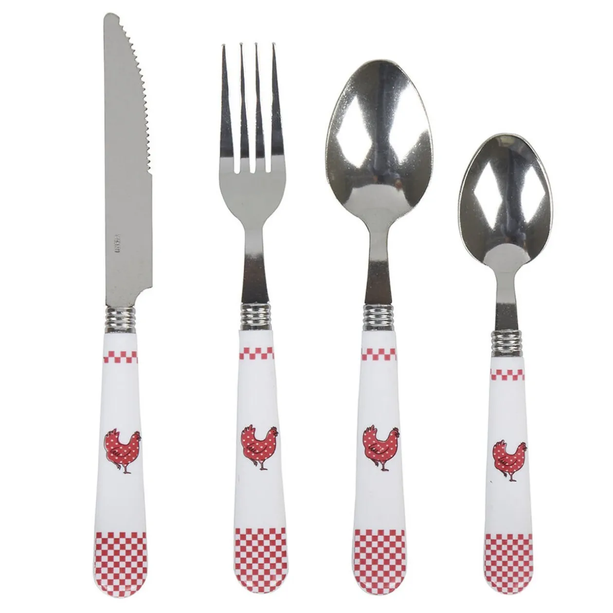 Révélez l’esprit champêtre de votre table avec cette ménagère de 24 pièces avec 6 fourchettes, 6 couteaux ronds, 6 grandes cuillères et 6 petites cuillères au motif poule et carreaux rouge.