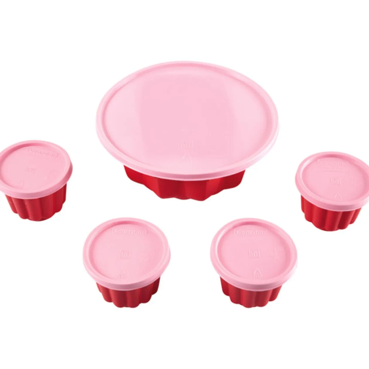 Moule à charlotte Ø 20 cm et 4 mini moules Ø 8 cm, plastique, livret de recettes.