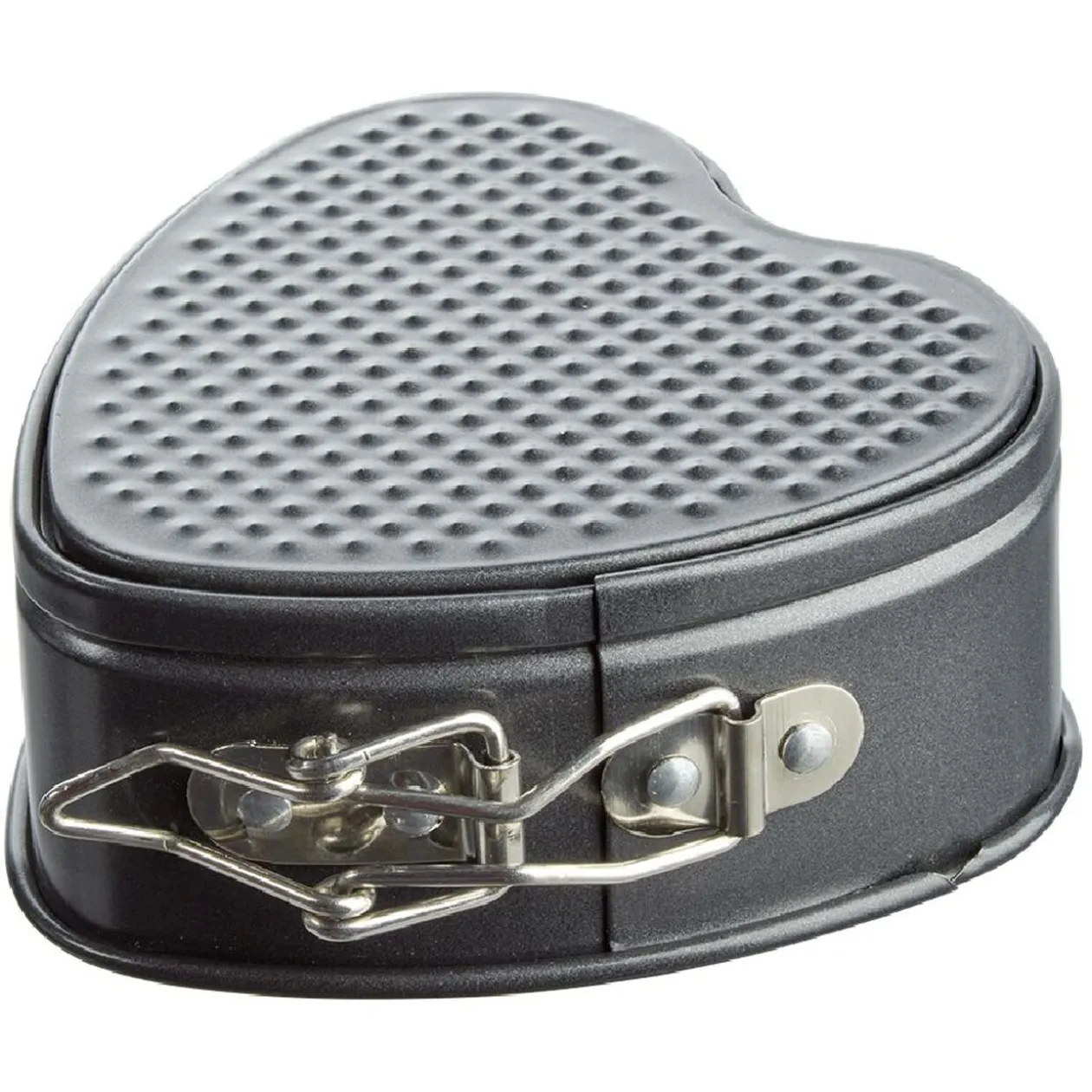 Moule à gâteau forme coeur en métal gris avec système d’ouverture/fermeture à charnière pour un démoulage facile.
