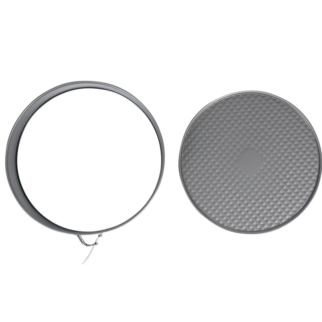 Moule à gâteau rond noir avec revêtement anti-adhésif et système de ouverture/fermeture à charnière pour un démoulage facile.