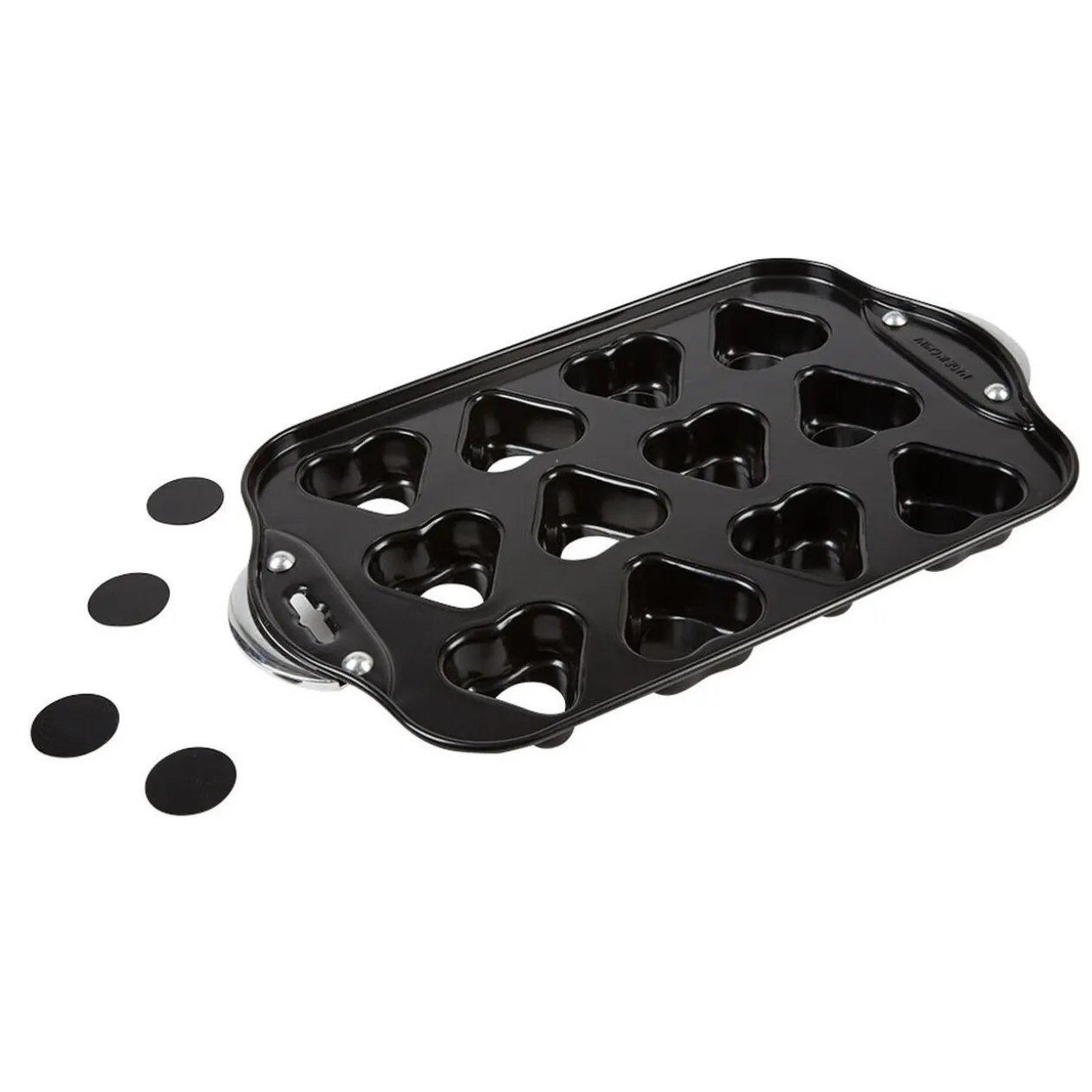 Moule pour 12 muffins en forme de coeurs à fonds amovibles ainsi le démoulage de vos pâtisseries sera parfait sans miettes ni effritements.