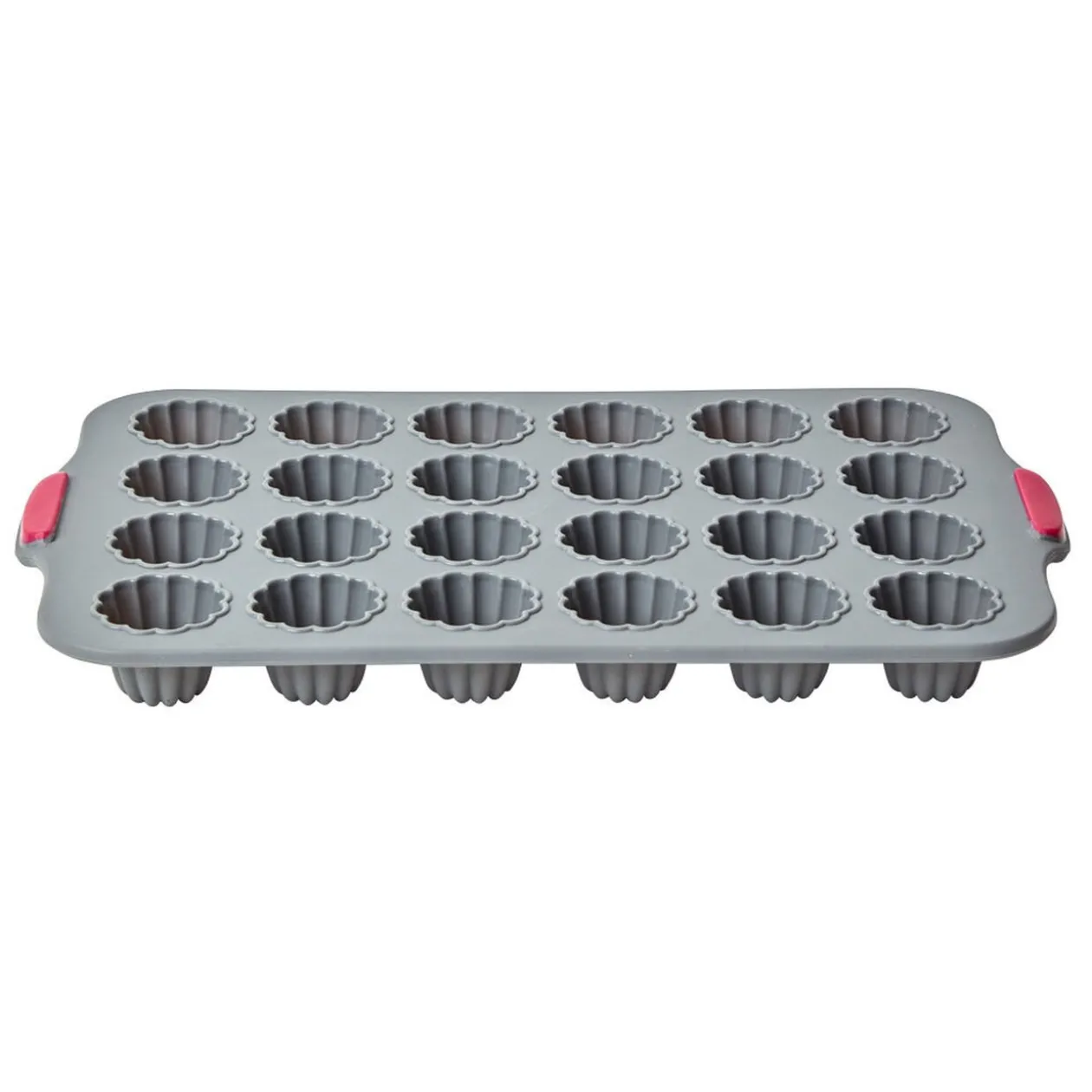 Moule en silicone gris avec structure métallique pour réaliser 24 cannelés simplement.