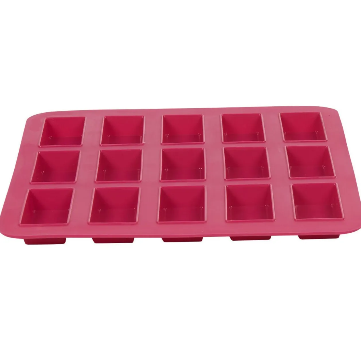 Moule carré en silicone de couleur rose avec empreintes pour la cuisson de 15 délicieux financiers.