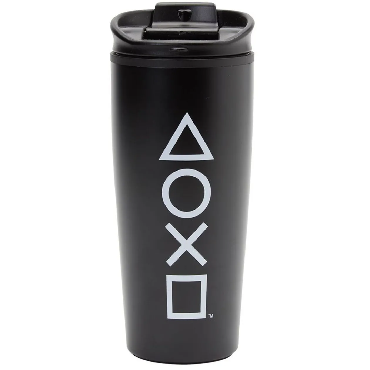 Mug de voyage en acier motif Playstation Onyx, idéal pour transporter vos liquides chauds en toute sécurité et pour longtemps.