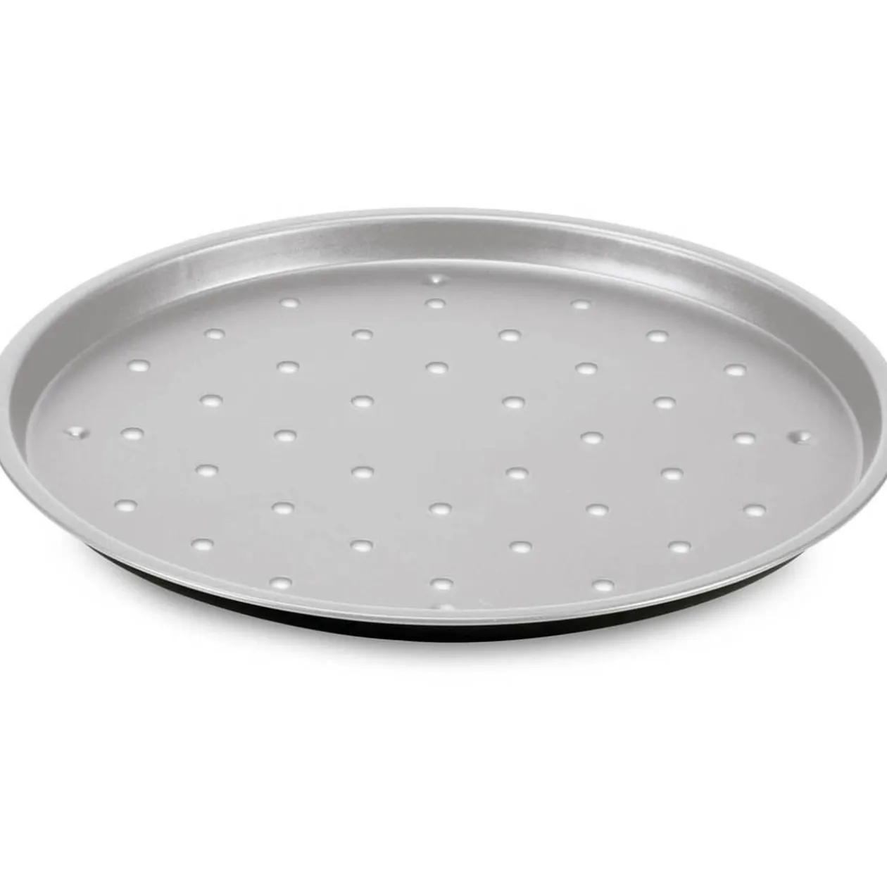 Faîtes cuire vos pizzas sans qu’elles ne collent au plat avec cette plaque ronde en acier anti-adhésif grise et noire.