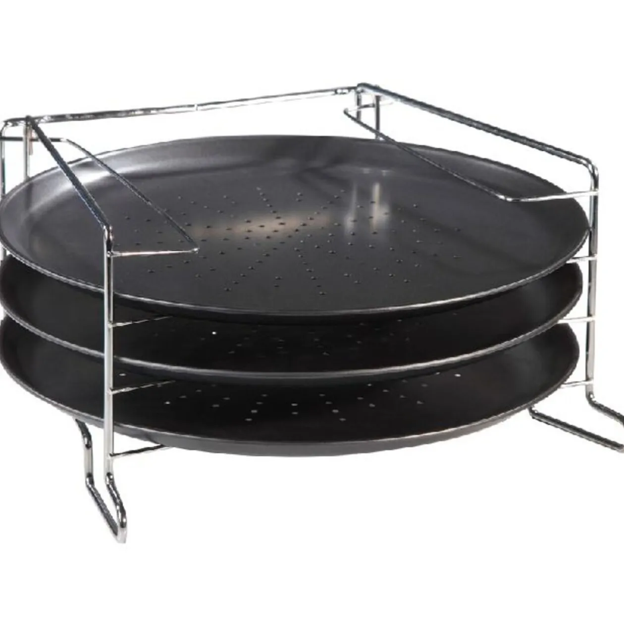 3 plaques à pizza Ø 30 cm, h. 16 cm. Son revêtement antiadhésif facilite son nettoyage.Fournies avec le support pliable en métal.