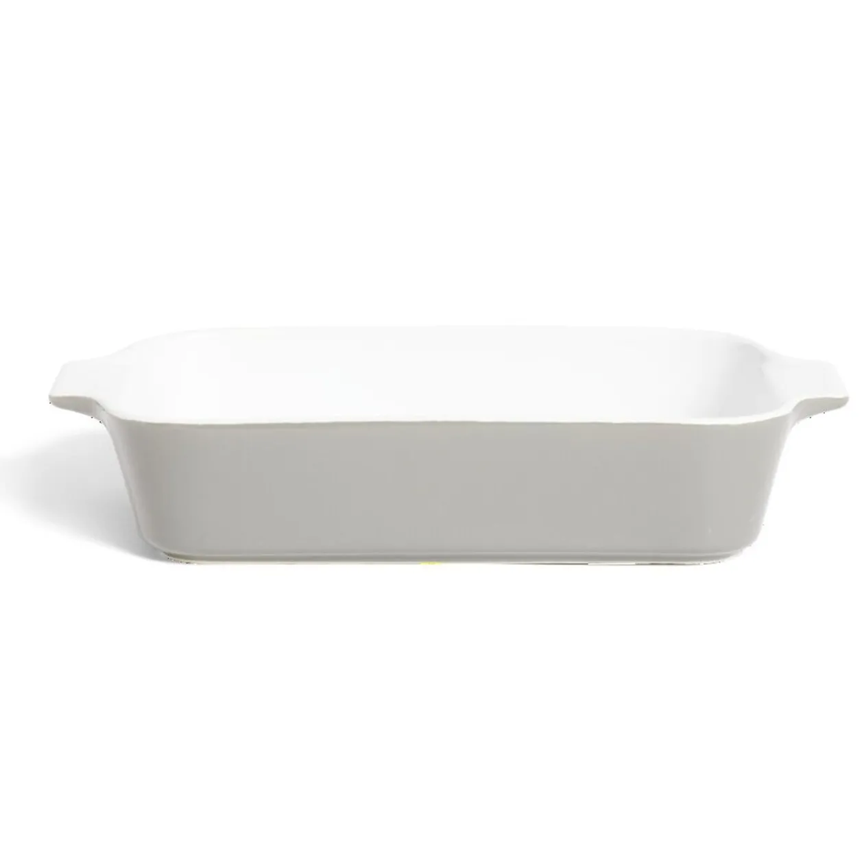 Robuste et polyvalent, ce plat à four en grès blanc sur l’intérieur et gris foncé sur l’extérieur est un ustensile de cuisine parfait pour la cuisson au four.