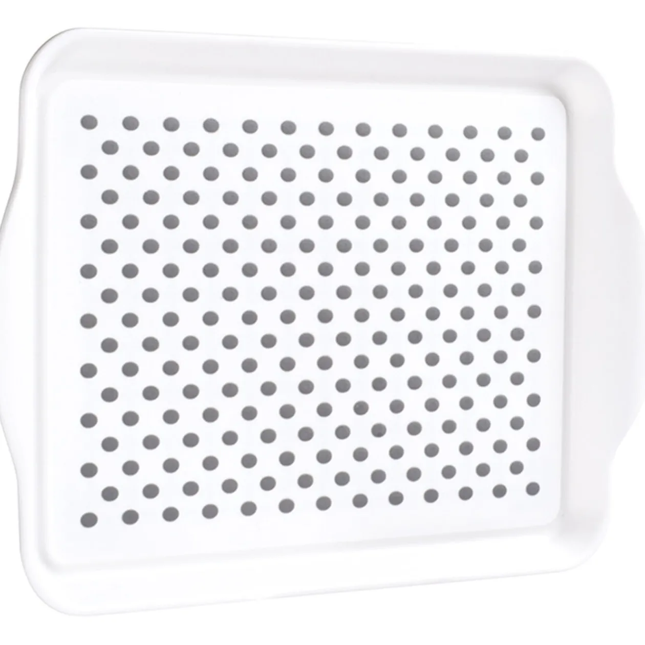 Plateau avec deux poignées et surface antidérapante en plastique gris et blanc, idéal pour un service sans encombre!