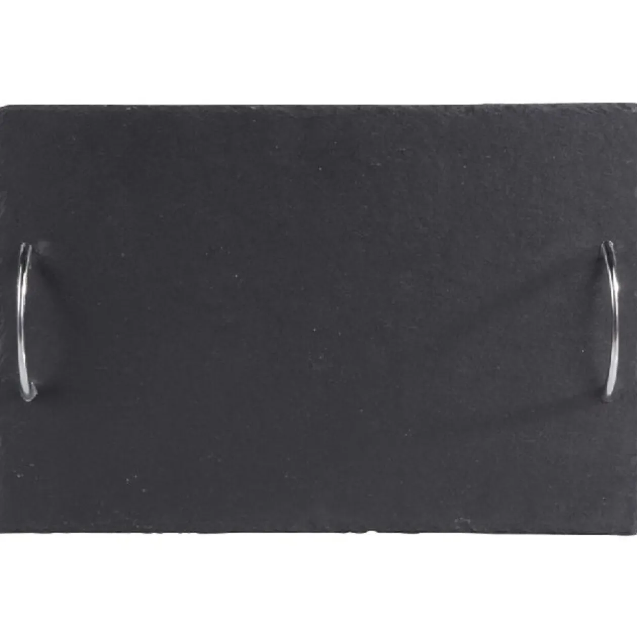 Plateau, dim. 45×30 cm, ardoise, poignées métal, tampons antidérapants.