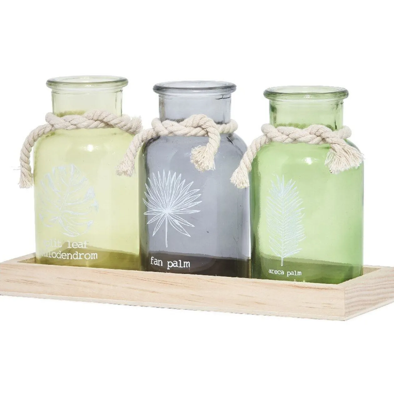 Ce plateau decoré de 3 photophores en forme de petites bouteilles de verre coloré gris, vert clair et vert foncé apportera une touche vintage et naturelle à votre décoration.