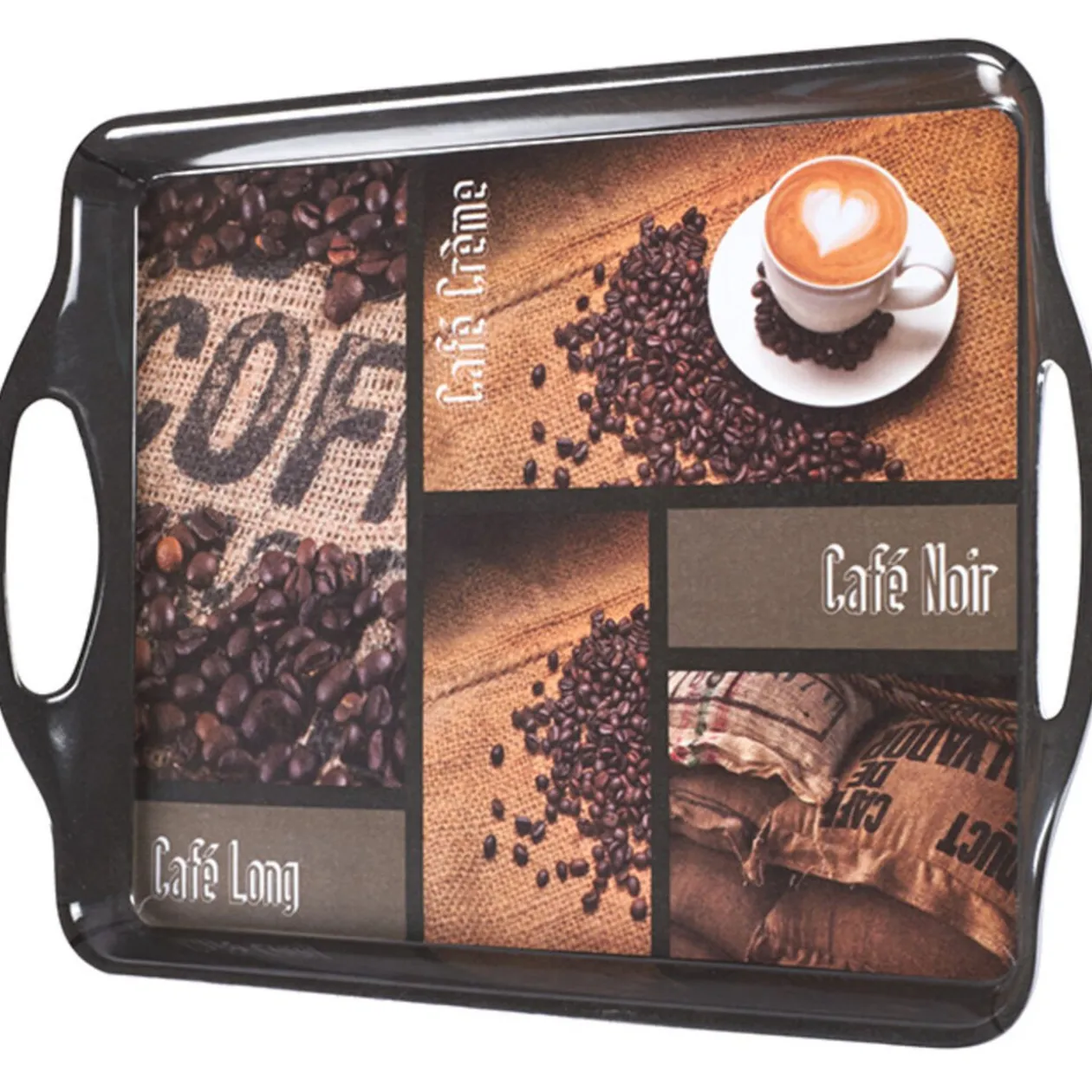 Plateau au motif Café, muni de 2 poignées pour une meilleure prise en main. Matière : plastique mélaminé. Dimensions : 50,5×34,5×3,3 cm.