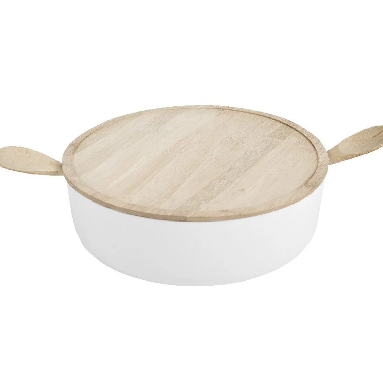 Saladier plastique avec plateau et couverts à salade en bambou. Dimension 10,5 x 31,5 x 31,5 cm.